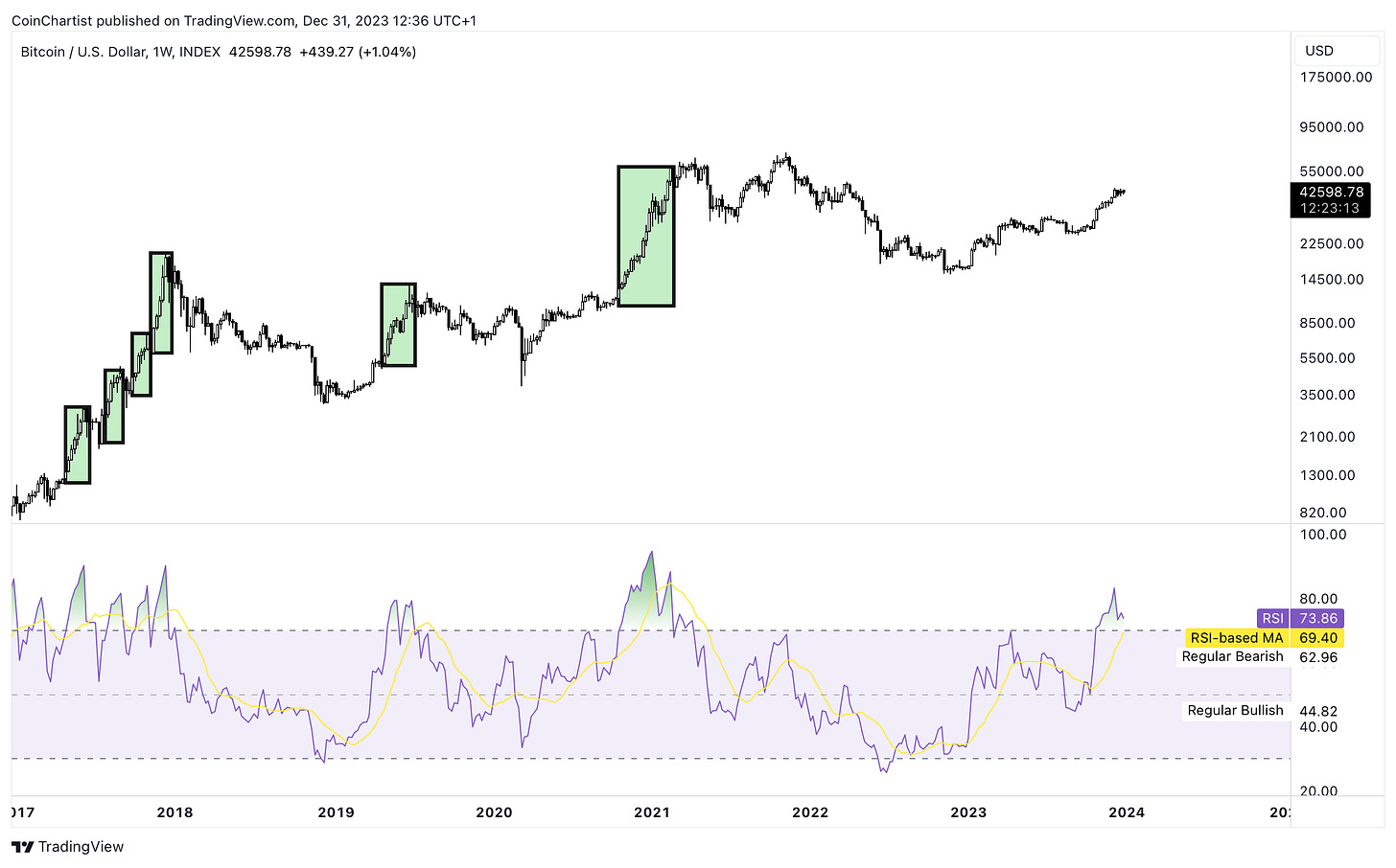 If for some reason, the initial ETF approvals are a sell the news event, and Bitcoin sees a deep correction, I still don’t think that is the end of the bull run. We will just be witnessing something more like 2017, versus anything we’ve seen in the last several years since. The weekly RSI in this case would act as our guide. Losing 70 on the weekly RSI would be a tell that this time is different than 2020 and 2021. A scenario like this could be possible as institutions might be more likely to secure profits than retail.