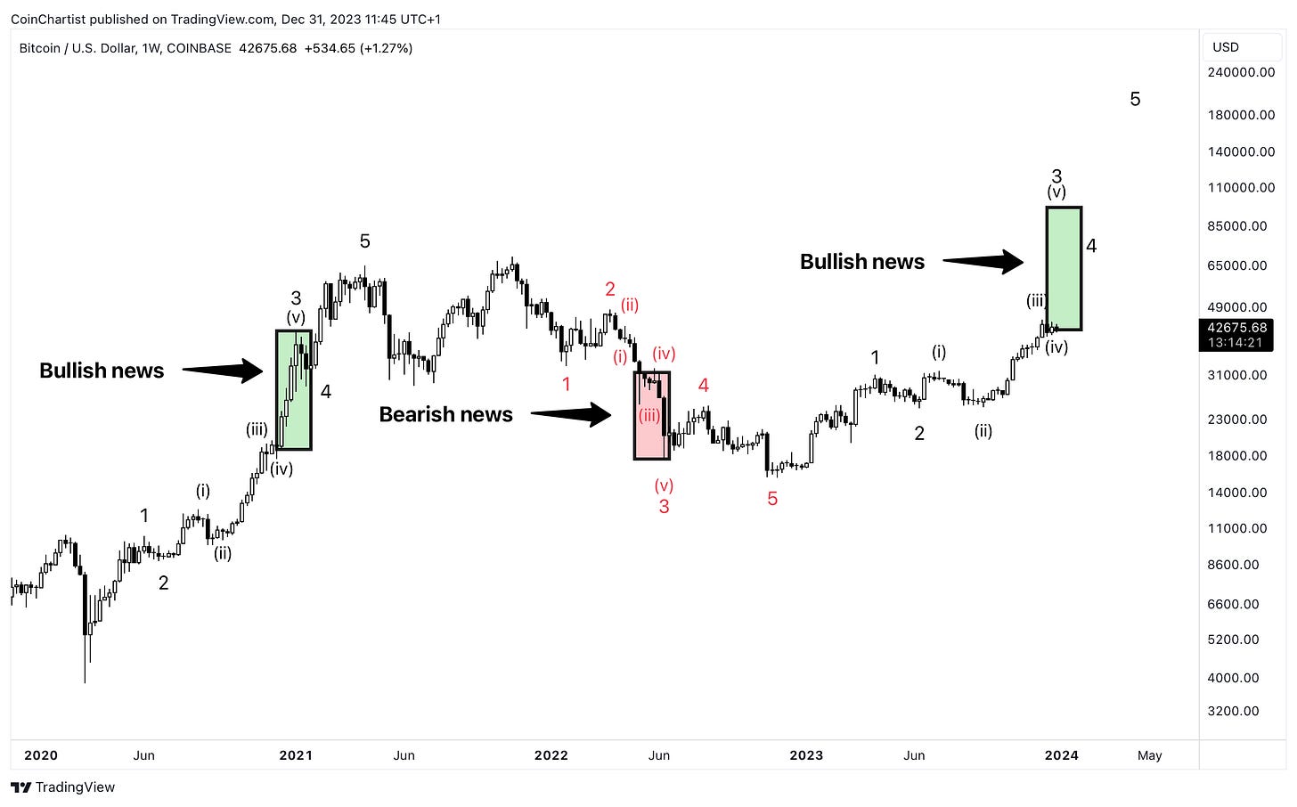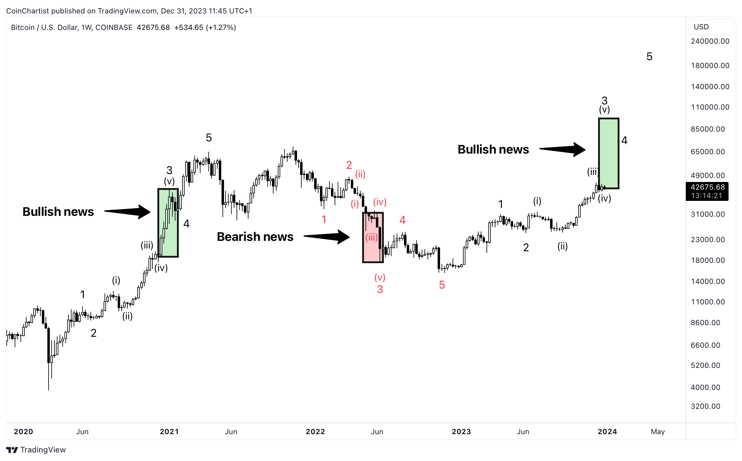 Bitcoin will close 2023 almost 3x higher than its 2022 bottom at $15,000. But what happens in the coming months, especially as spot BTC ETFs begin to see approvals from the SEC? According to my Elliott Wave Principle count Bitcoin ideally should be entering its most bullish phase where it moves the strongest and fastest. The reason for this is because of how mass crowd psychology unfolds. This is the part of the trend where stubborn hold outs finally give in and flip bullish. This is driven by a backdrop of bullish news. You may recall back in 2020 through early 2021, where the green box is highlighted, that the price action was supported by MicroStrategy buying BTC, Tesla buying and accepting BTC, and other factors. Even the red box showing a downward impulse was driven by the worst news of the bear market. If another impulse takes Bitcoin much higher, it will be driven by ETF approvals and the onslaught of investment these firms and products will be receiving.
