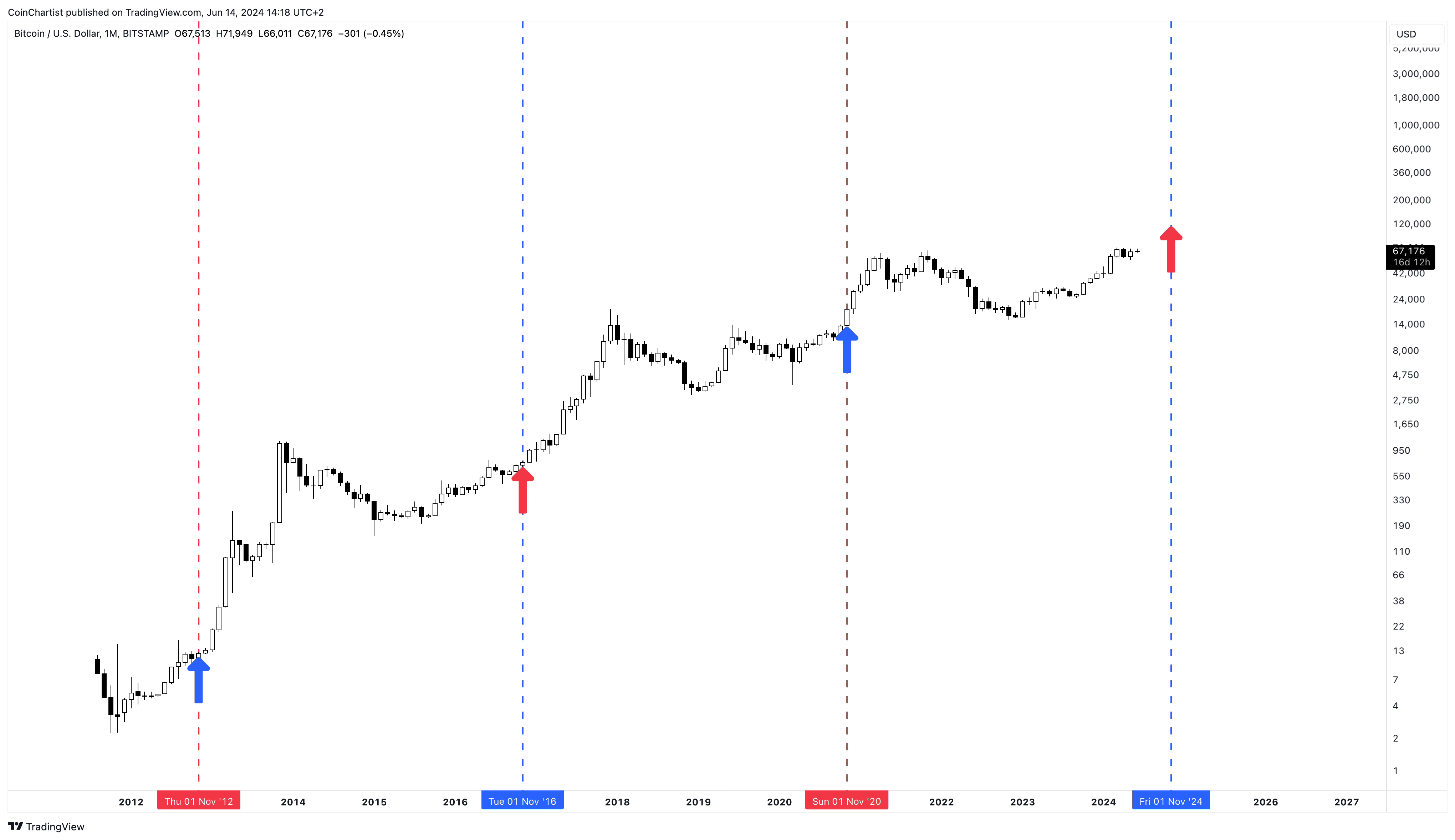 To begin, each market cycle tends to kick into overdrive after the US Presidential election takes place. Each dashed line shows the election in November every four years. As you probably know, Bitcoin is said to follow four year cycles that coincide with each halving event.