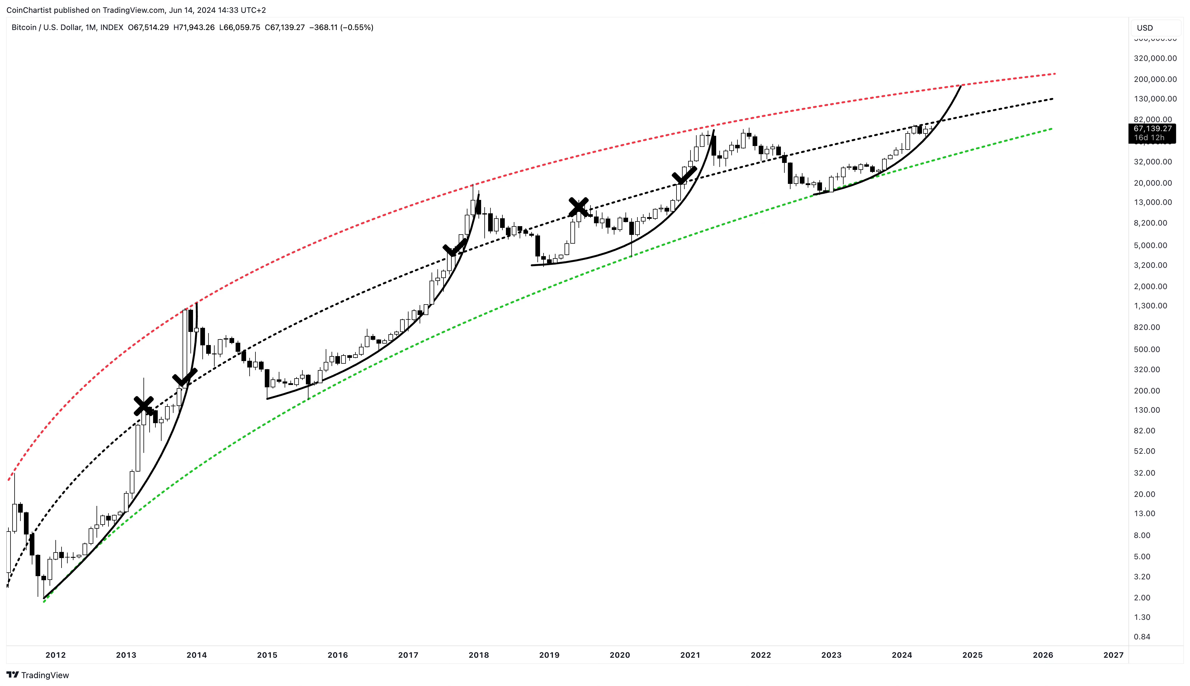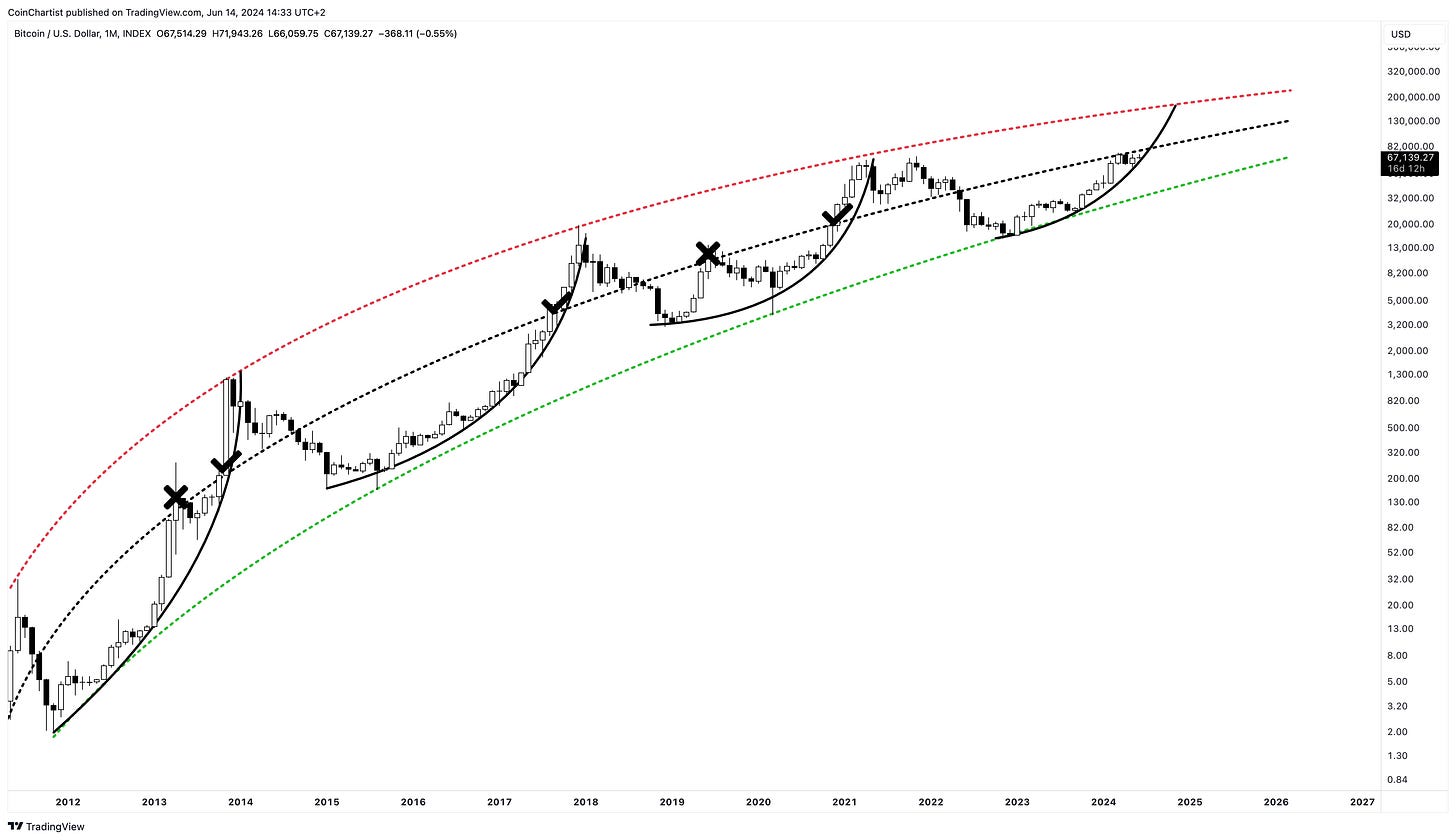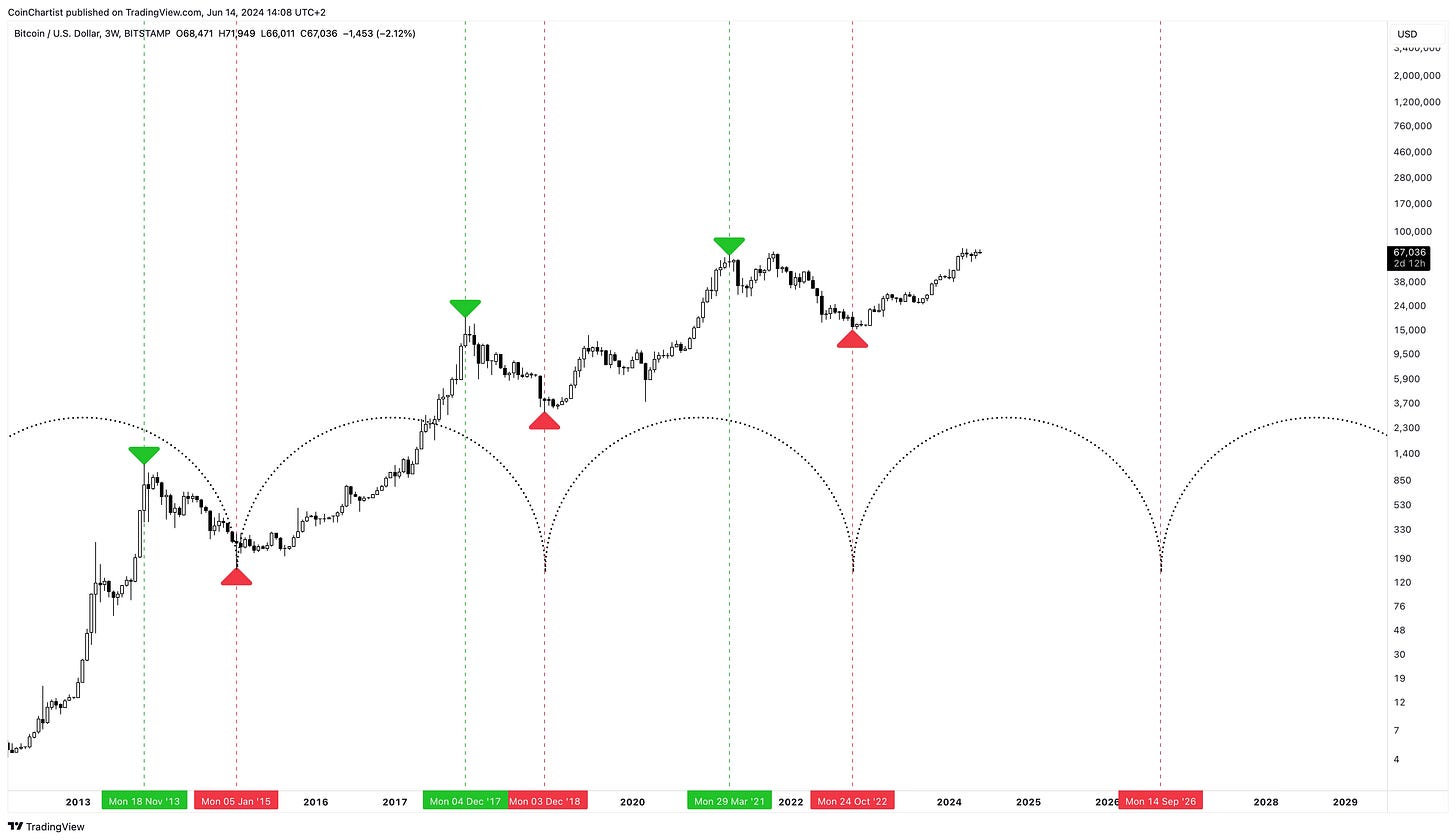 Cycle analysis also shows that most Bitcoin bull markets peak after the crest is reached time wise. The bottom is put in at each cyclical trough. This could indicate that a top of this cycle occurs closer to November or December of 2024, possibly extending into Q1 or even Q2 of 2025.