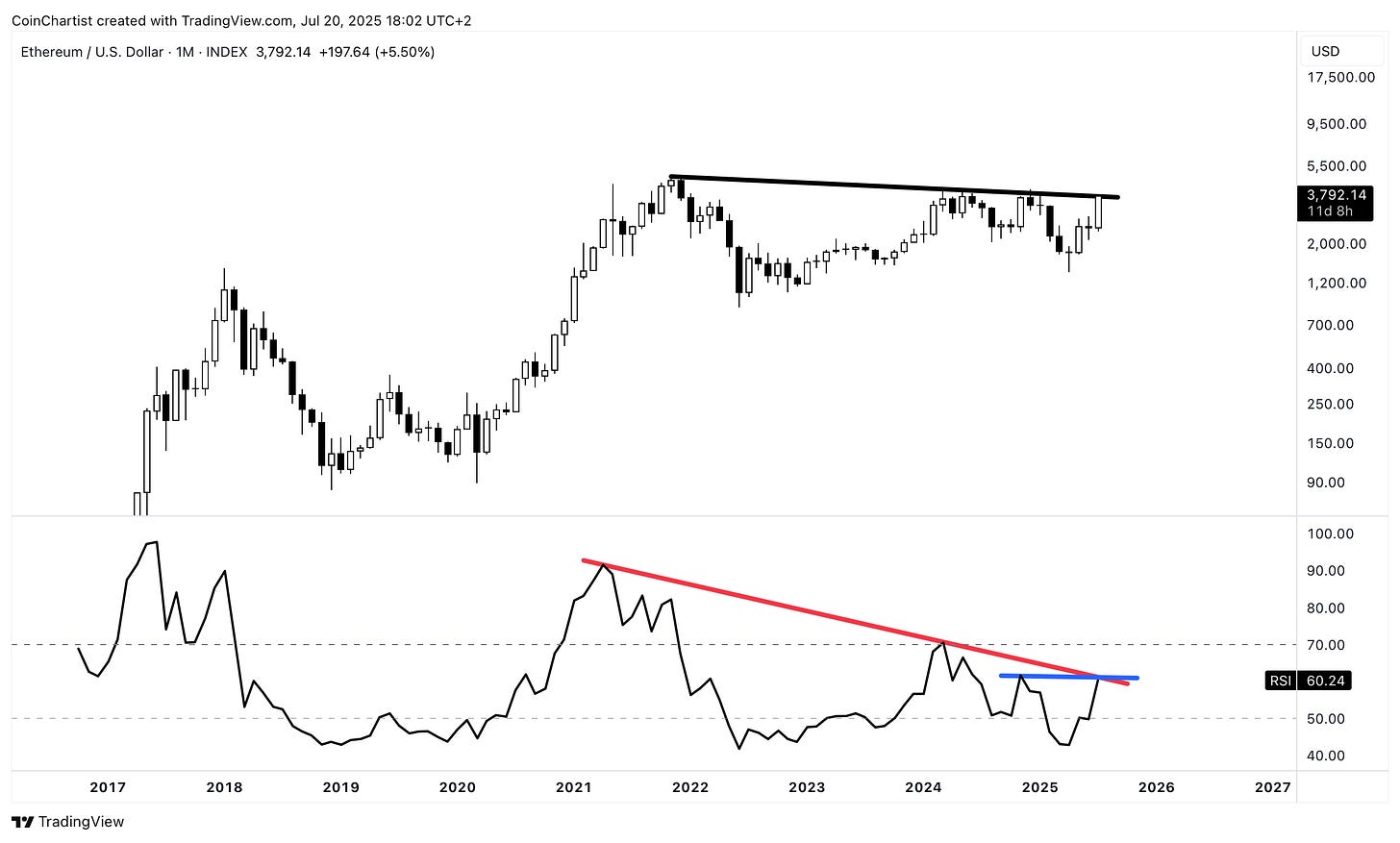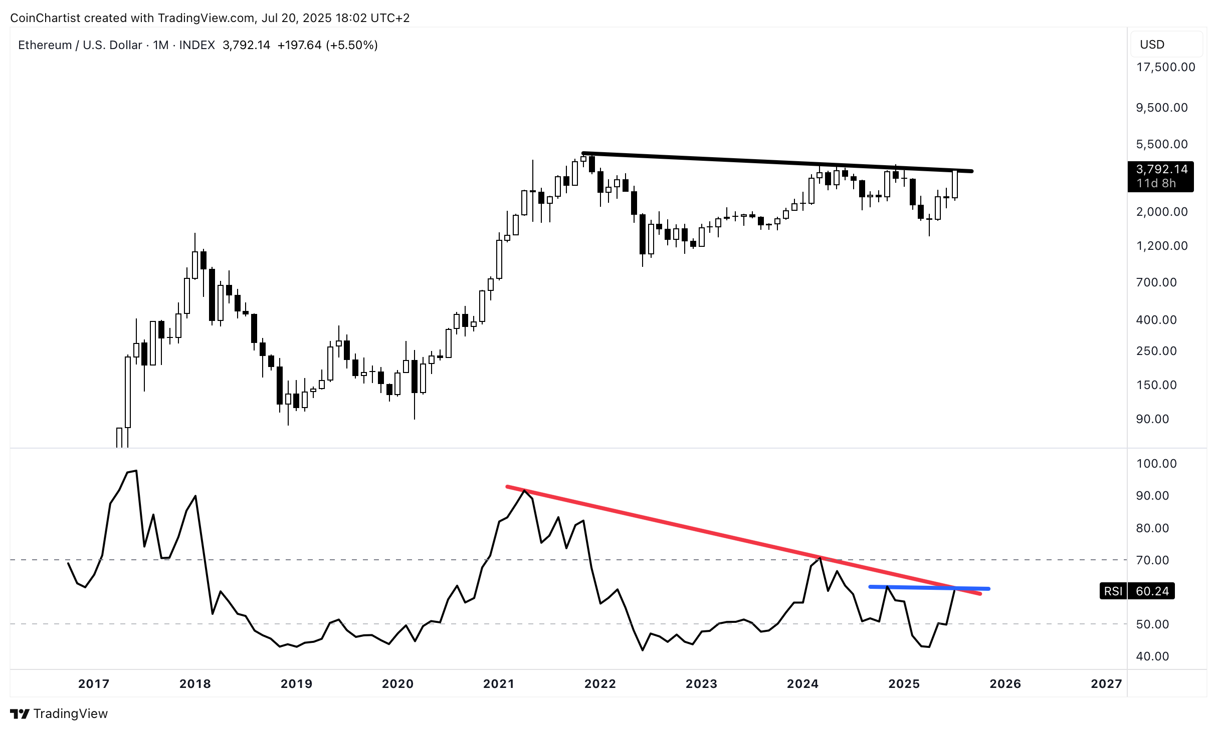 Here, we can see that Bitcoin is close to triggering some significant breakouts. The monthly RSI is right below a red downtrend line and just above it will trigger a buy signal from a higher high. The double combination of triggers so close to one another should lead to some serious strength.