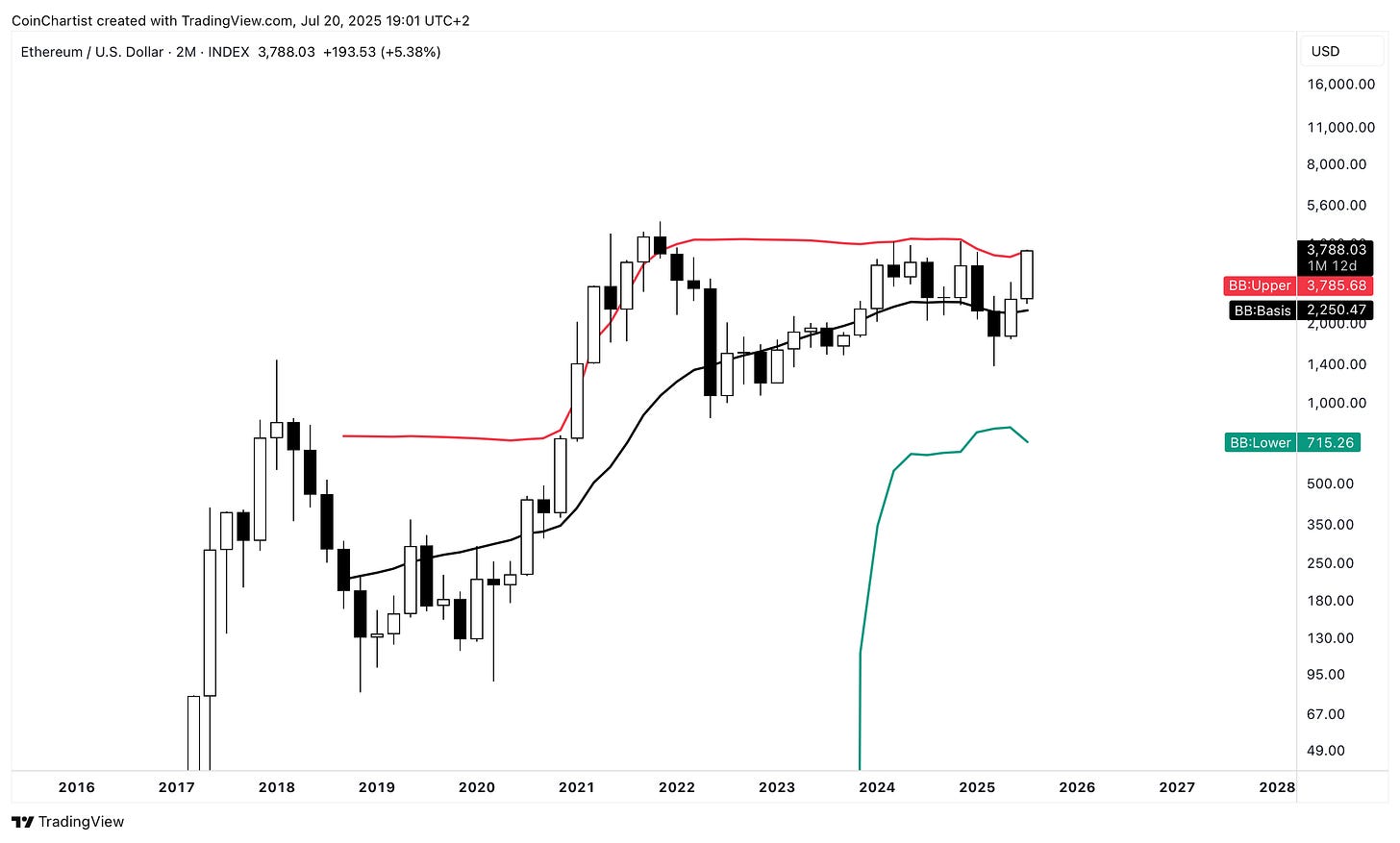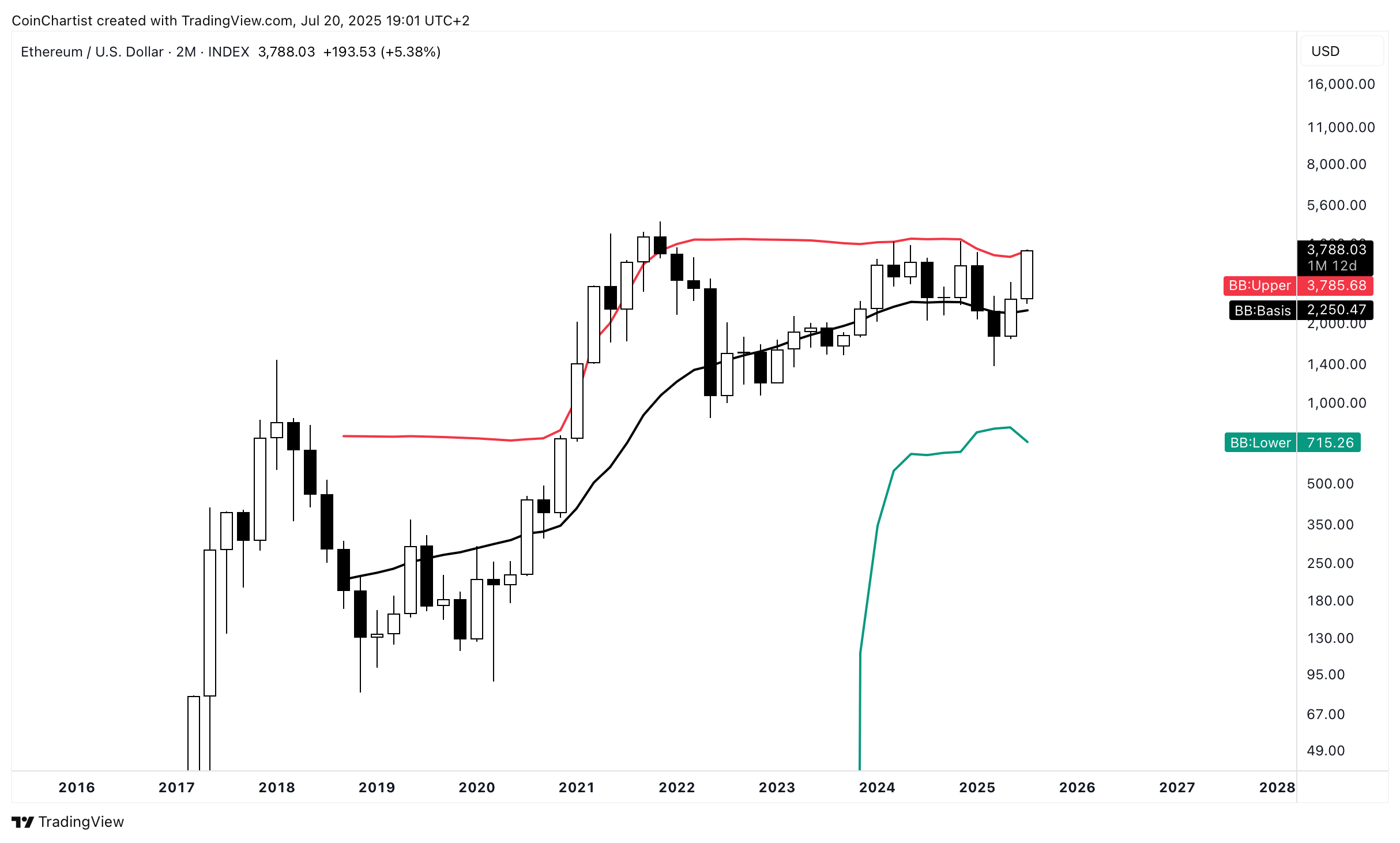 On the highest timeframes, this shows signs of a true explosive move – possibly one of the biggest ever in crypto. ETHUSD is above the upper Bollinger Band on the 2M timeframe while the bands are starting to expand from the tightest reading ever.