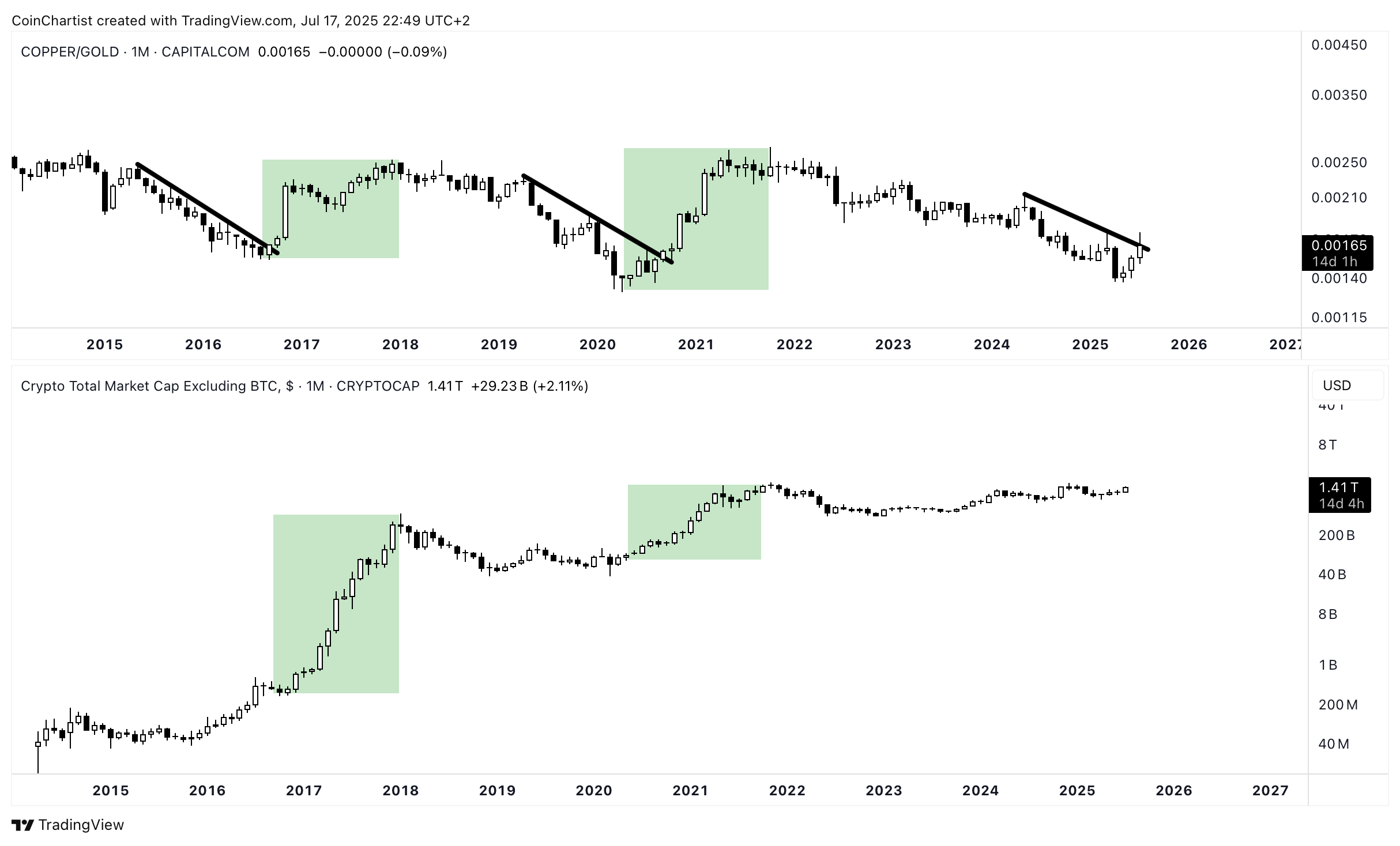 The chart above shows the Copper/Gold ratio, flipping in favor of Copper. Below this ratio, is the TOTAL cryptocurrency market chart, with two green phases highlighted. During these phases, the Copper/Gold ratio flipped risk-on like we are seeing now, and the cryptocurrency market posted some of its largest gains ever. With the ratio now favoring Copper again, the market is risk-on.
