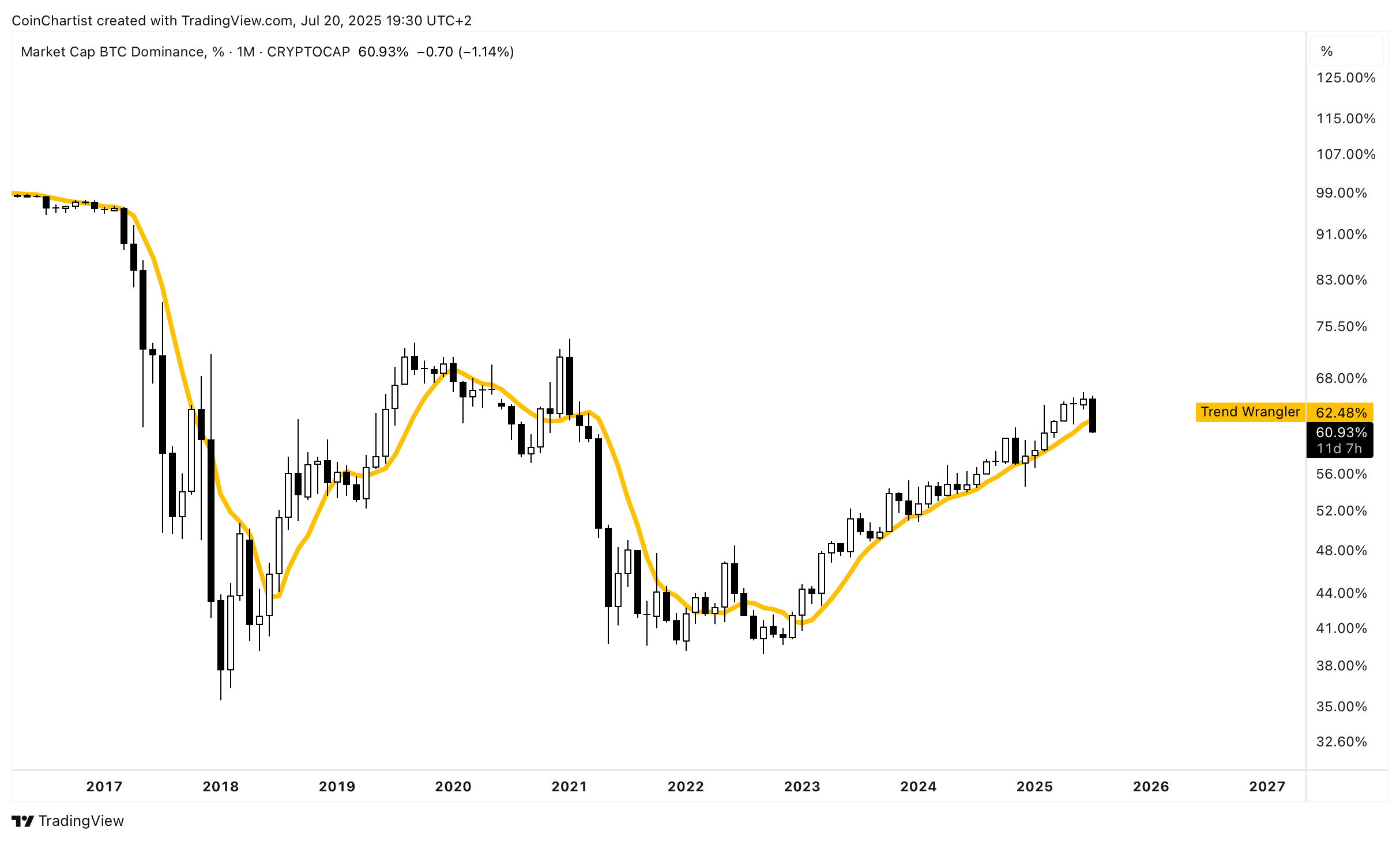 BTC.D’s monthly candle body is below the Trend Wrangler. It needs to close below it by the end of the month, but the potential is significant if it can confirm. BTC.D hasn’t closed a single monthly candlestick below the Trend Wrangler since late 2022/early 2023. Remember, you can get access to the Trend Wrangler and other tools by becoming a premium subscriber.