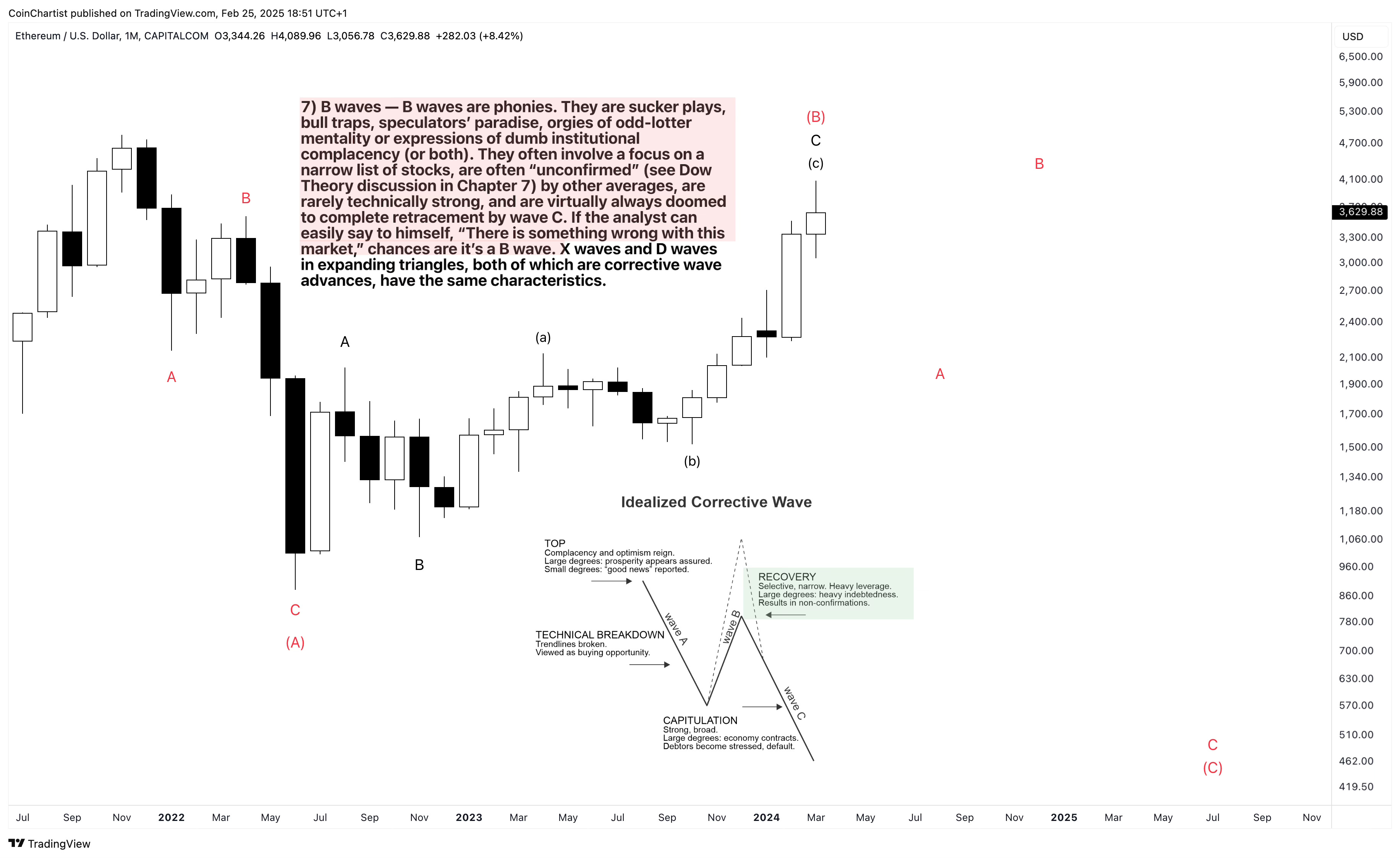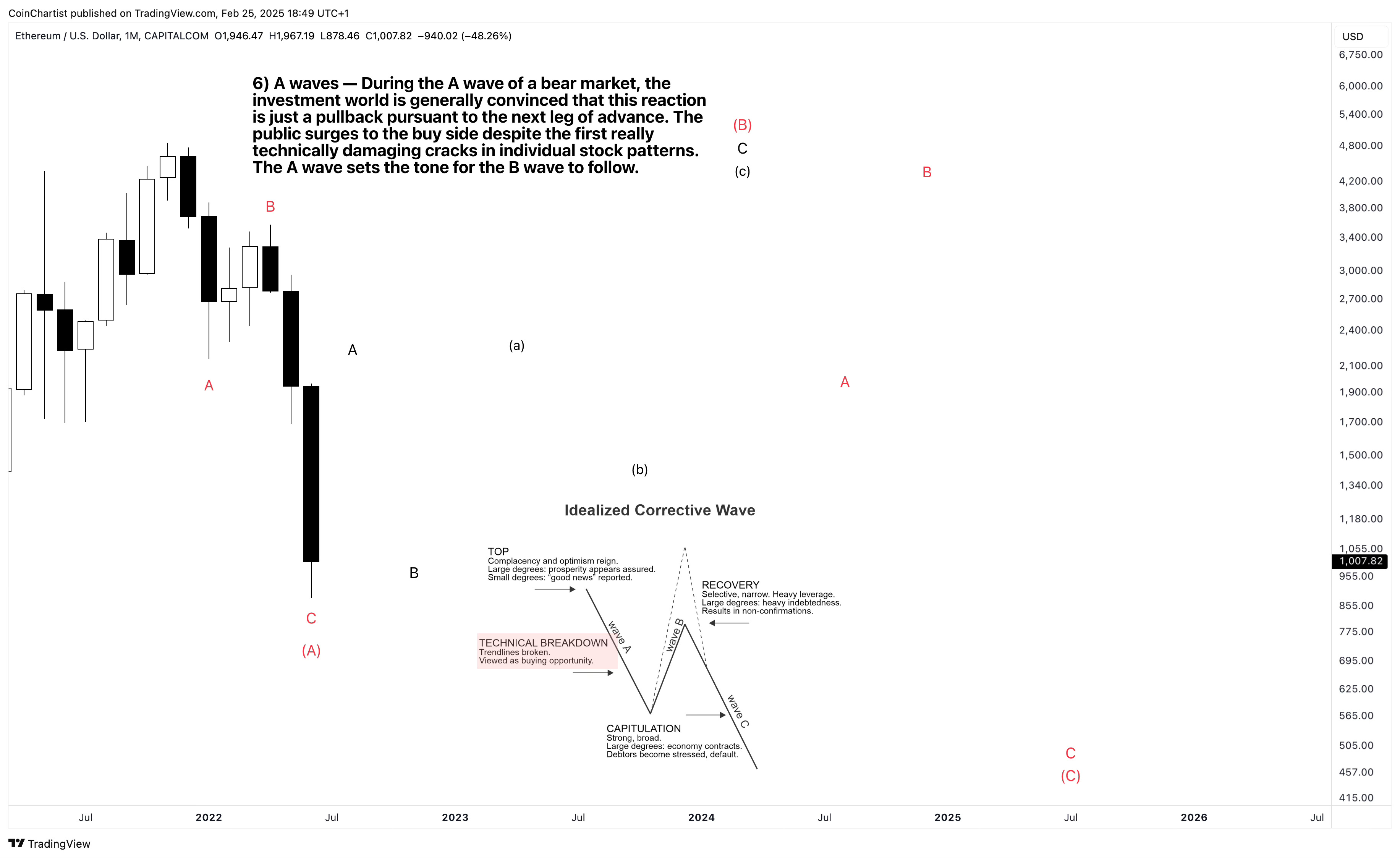Much like we mapped out Bitcoin using wave personalities, let’s do so with Ethereum and start with its A wave. Wave A is widely viewed as a buying opportunity in advance of the next major rally. The “public” scrambles to the buy side despite technical cracks beginning to show. This mistake makes the C wave especially devastating.