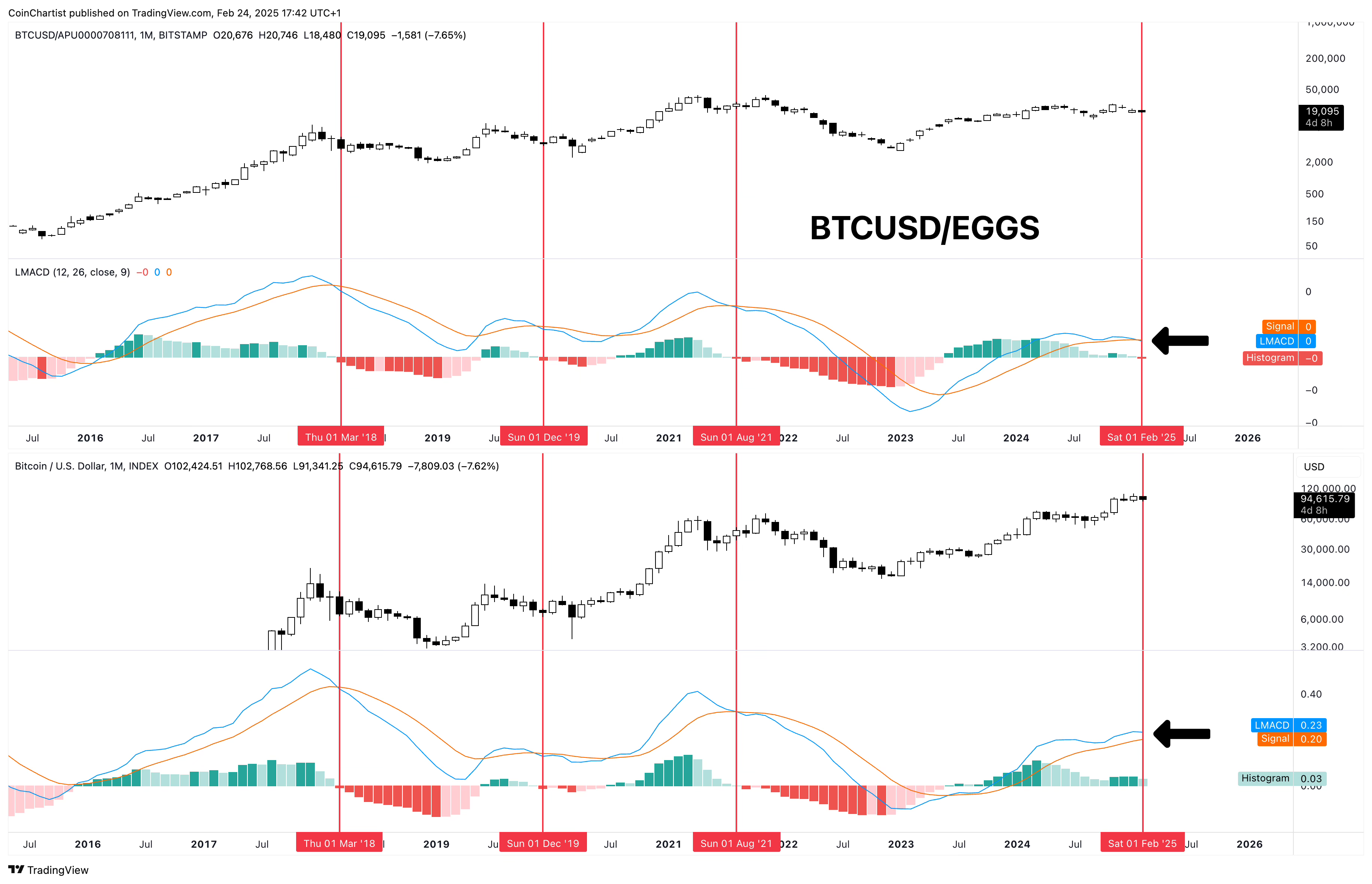 Eggs just hit a new all-time high. This food staple charted against Bitcoin as a ratio could be telling us early that a bear market is coming. I know it’s an unusual one, but I cannot unsee the chart. If we look at past red vertical lines, a bear market always started when the LMACD of BTCUSD/EGGS crossed bearish on the monthly. I’ve added the regular BTCUSD chart and its LMACD at the bottom for comparison. Notice how all past peaks were 1:1 with eggs. This cycle, however, BTCUSD/EGGS is crossing bearish this month in February, while the regular BTCUSD chart is still showing a green histogram and lack of bear crossover. Which chart is telling us the truth?