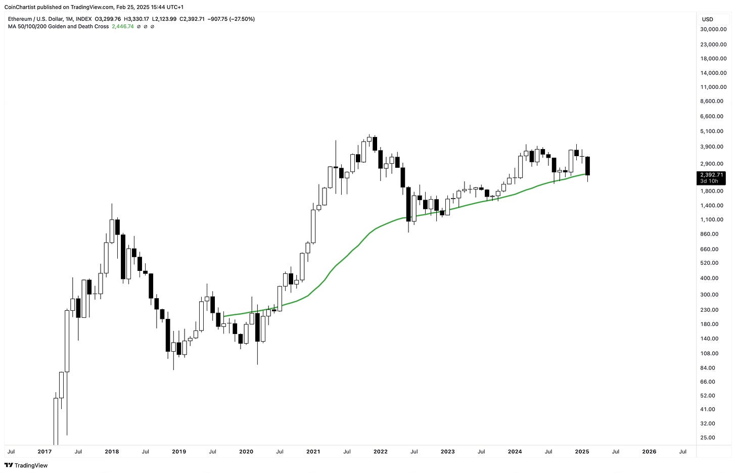 Ethereum is also currently below the 50-month Moving Average. There have been closes below it in the past, but price has always rebounded immediately after. Will that happen again, or will it be lost this time in a dramatic fashion?