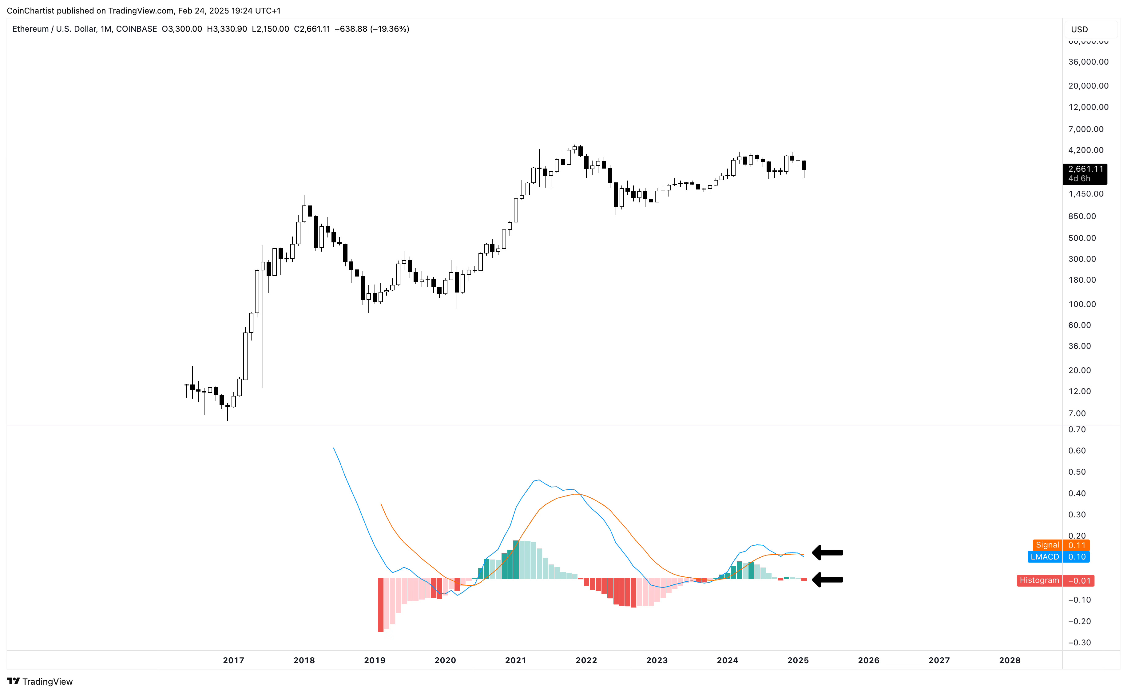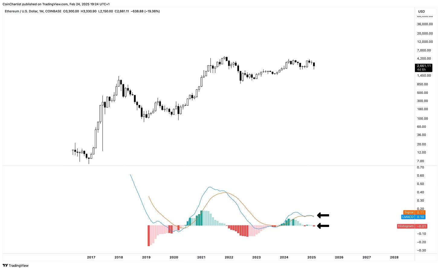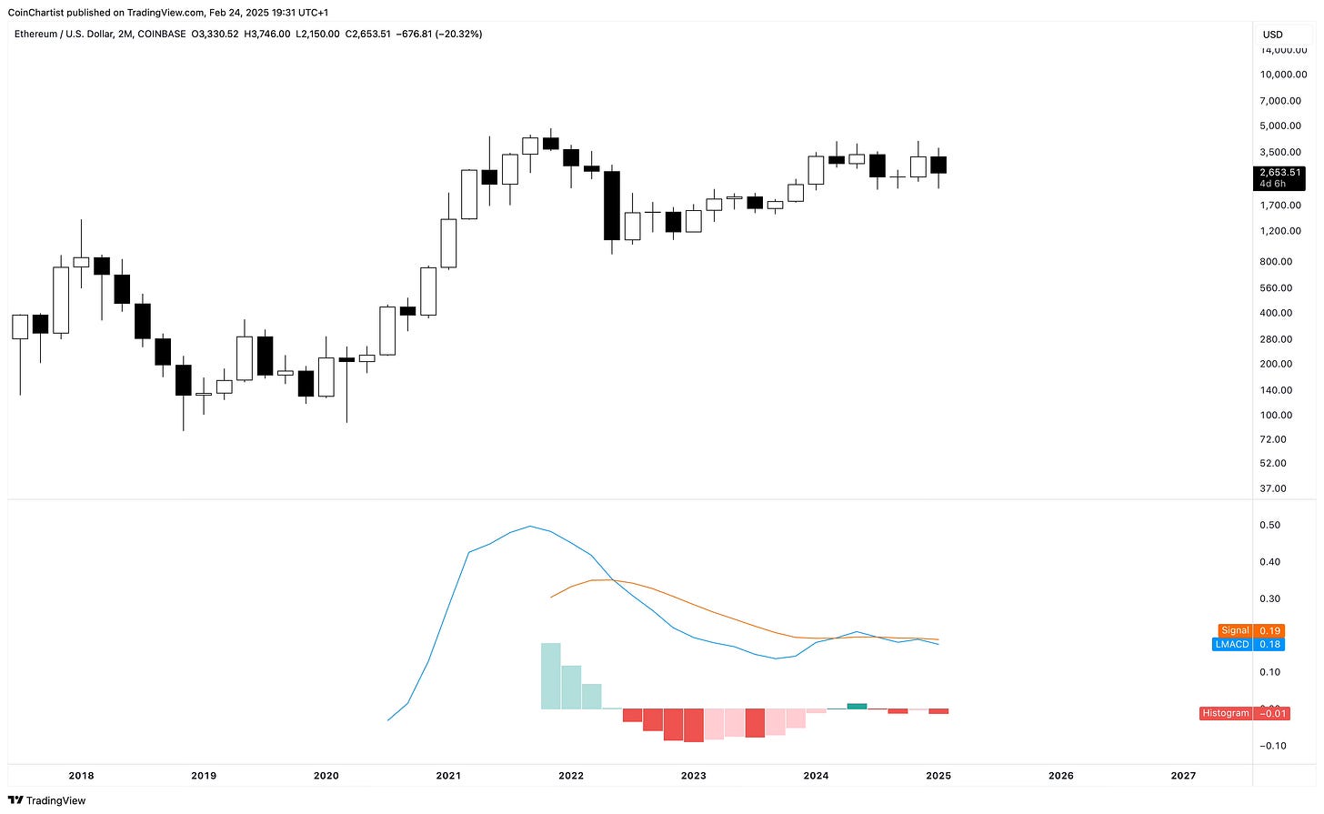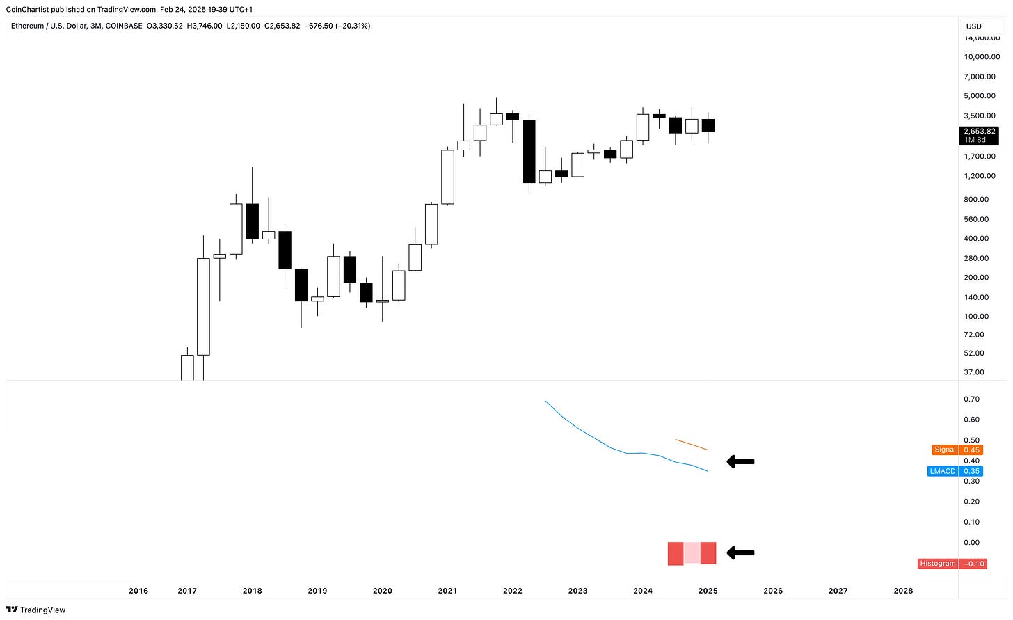 Like prior TA, Ethereum could be bottoming instead of falling off a cliff. A recovery in the next 3 days into March is necessary for an ETHUSD revival. The monthly LMACD is showing a bearish crossover and dark red tick on the histogram. This can change within the next 3 days, but it doesn’t look likely and a negative monthly close could cause a high timeframe domino effect.