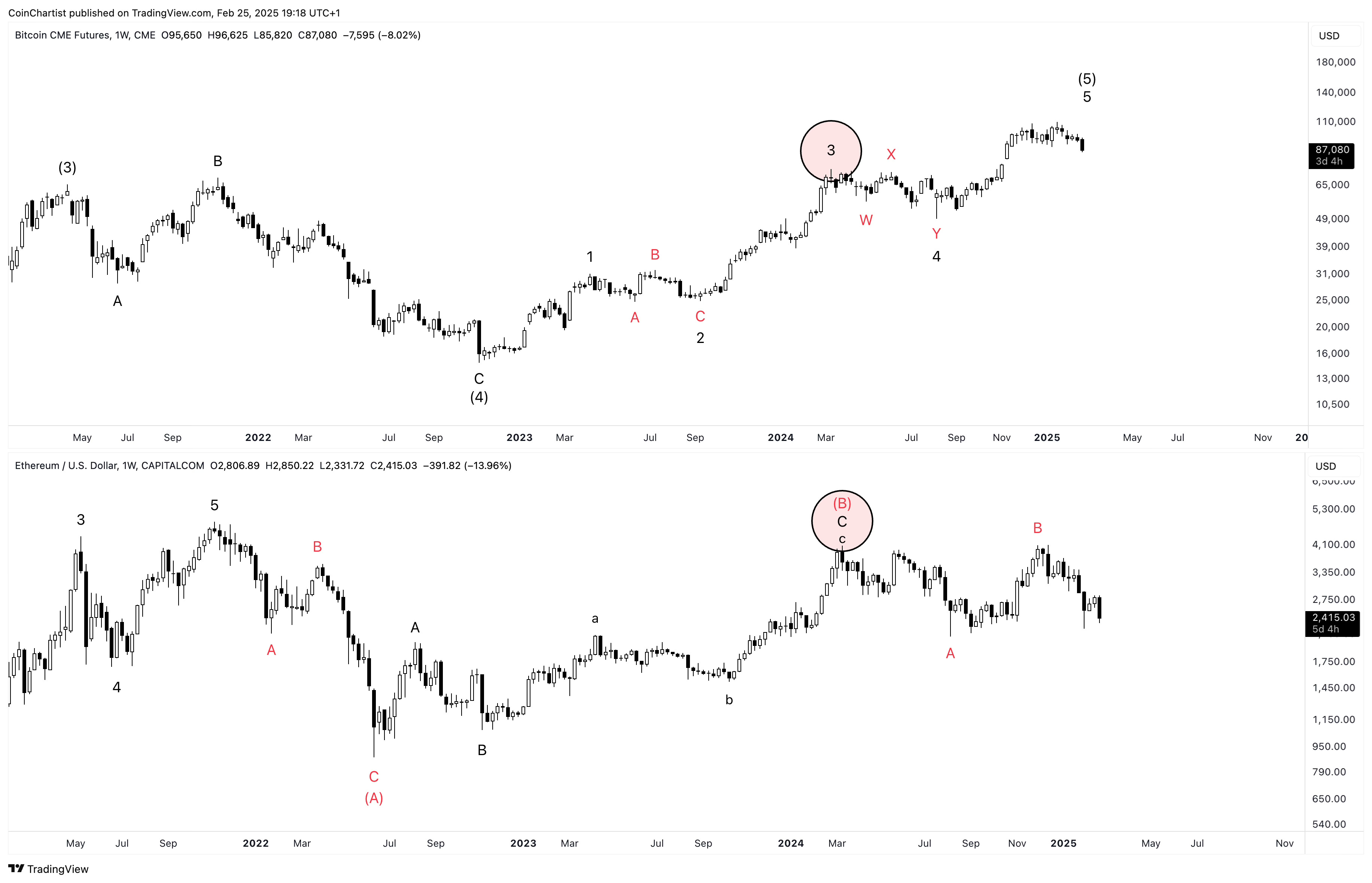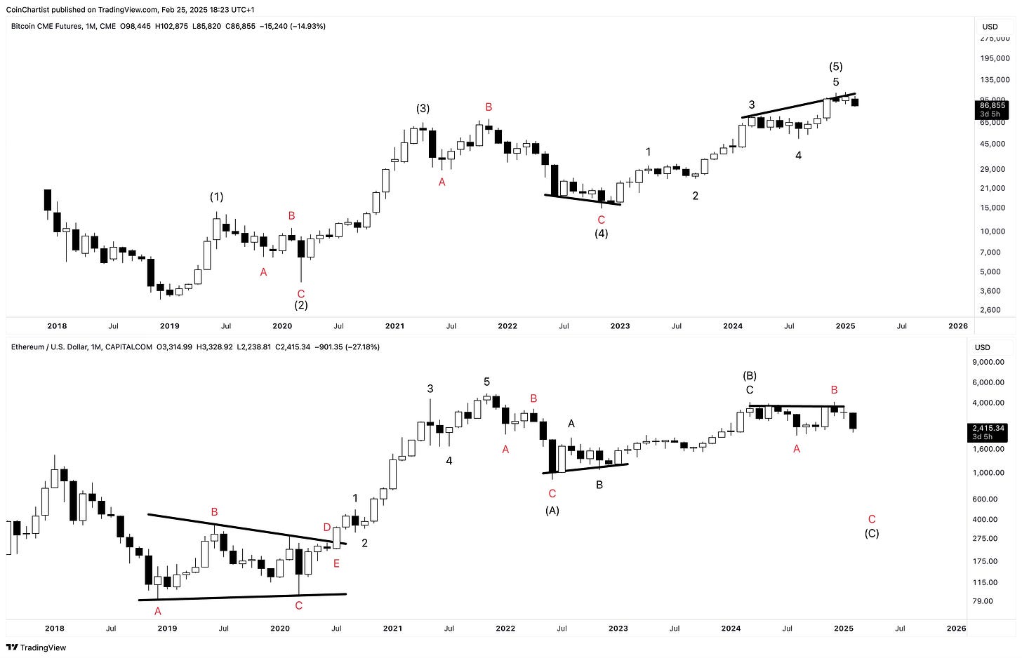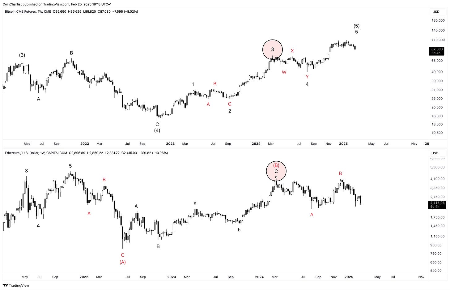 Looking only at price action from 2022 forward, we can see that Bitcoin displays the “right look” while Ethereum does not at all. That’s because I believe Ethereum started its larger bear market during Bitcoin’s wave 4, just like the EW textbook states about wave personalities. That would mean that the entire rally from 2022 to 2025 was a bear market rally and the B wave of a larger correction.