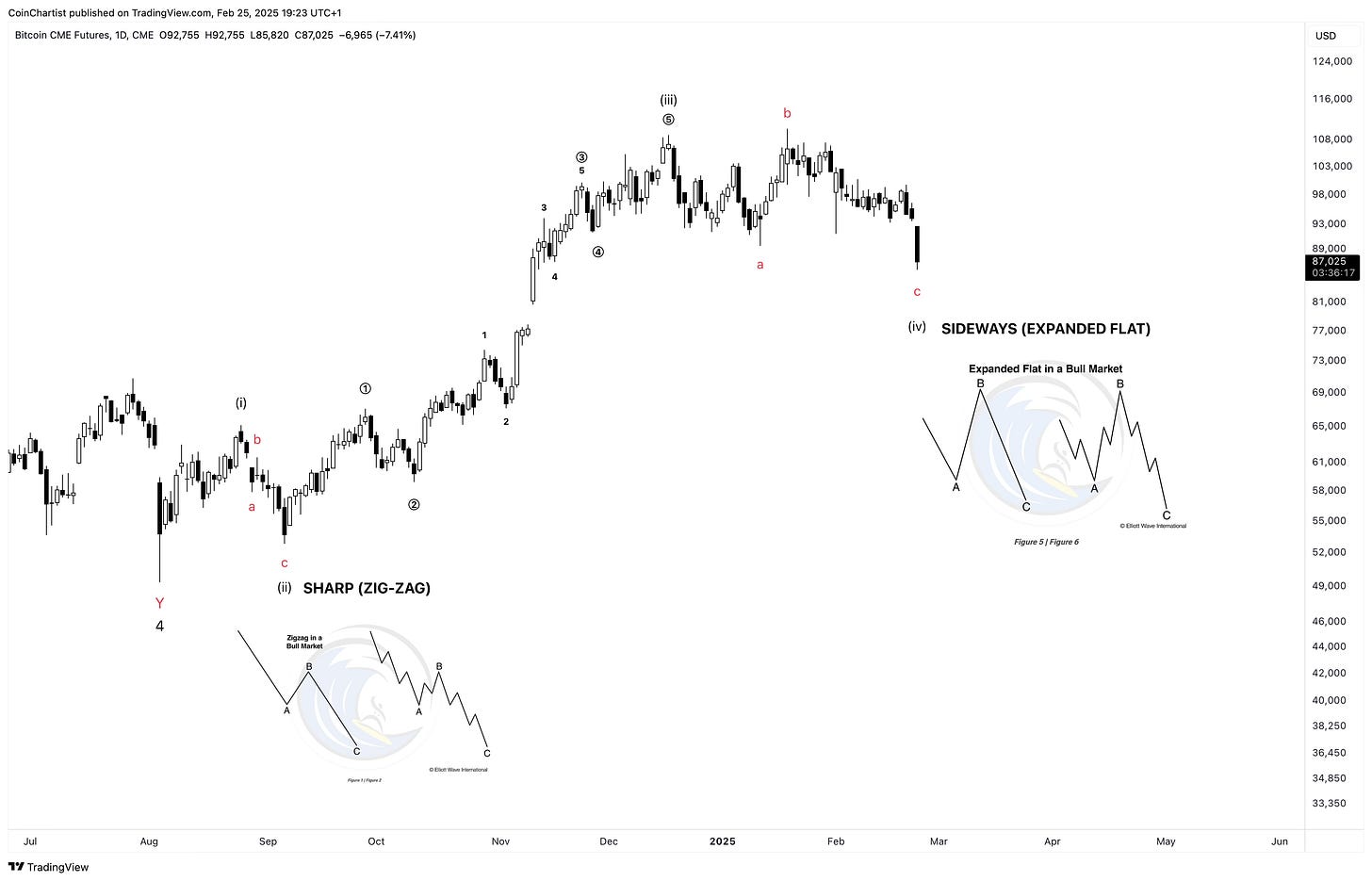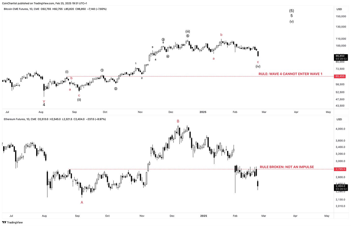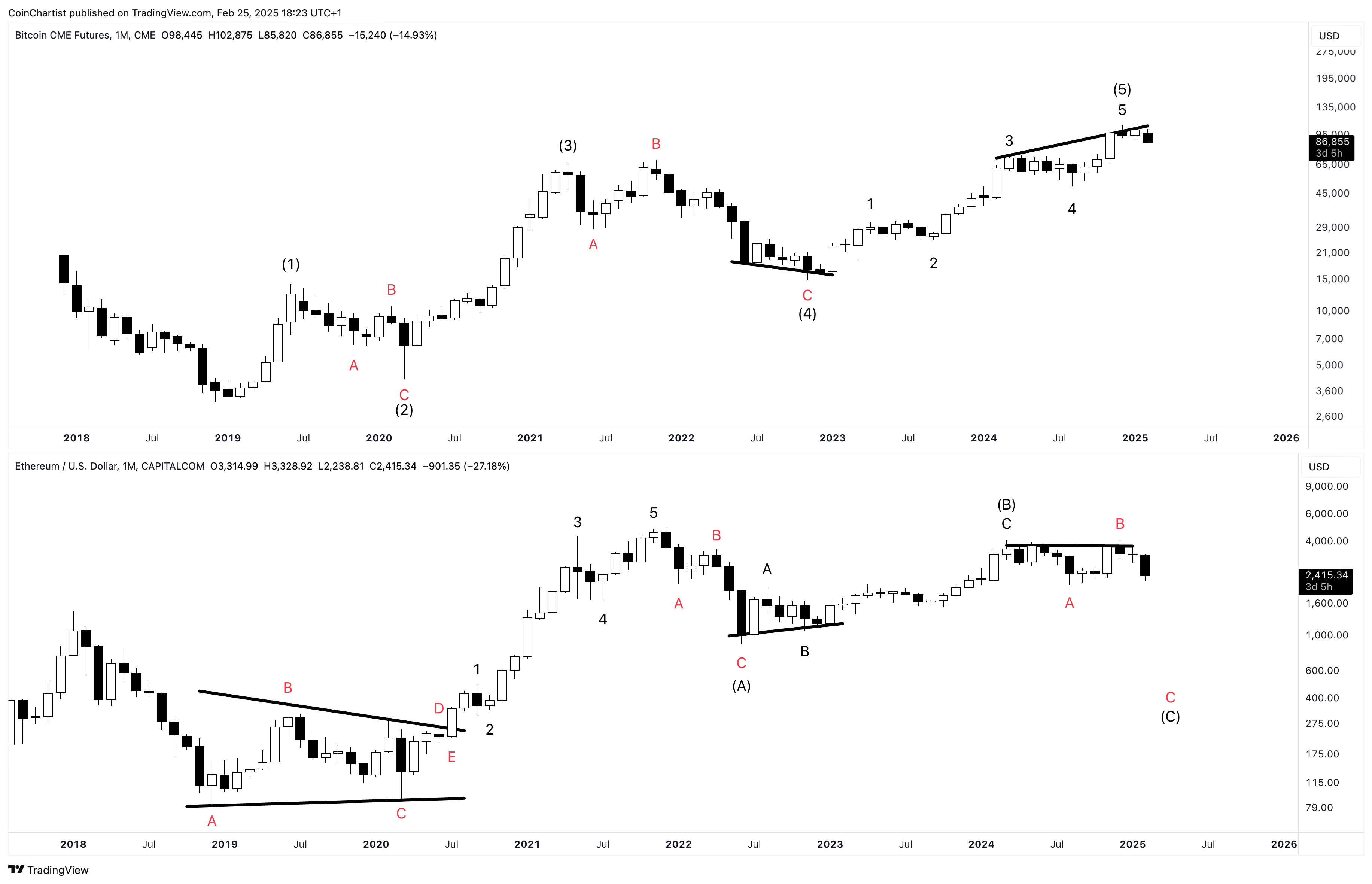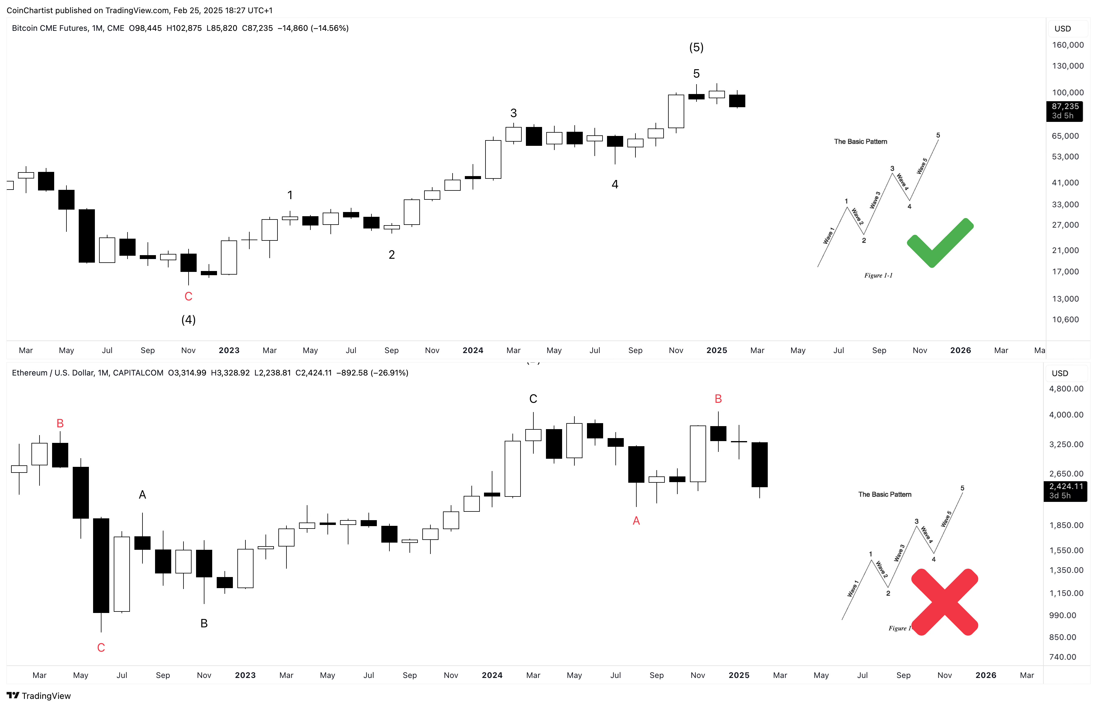 Looking only at price action from 2022 forward, we can see that Bitcoin displays the “right look” while Ethereum does not at all. That’s because I believe Ethereum started its larger bear market during Bitcoin’s wave 4, just like the EW textbook states about wave personalities. That would mean that the entire rally from 2022 to 2025 was a bear market rally and the B wave of a larger correction.