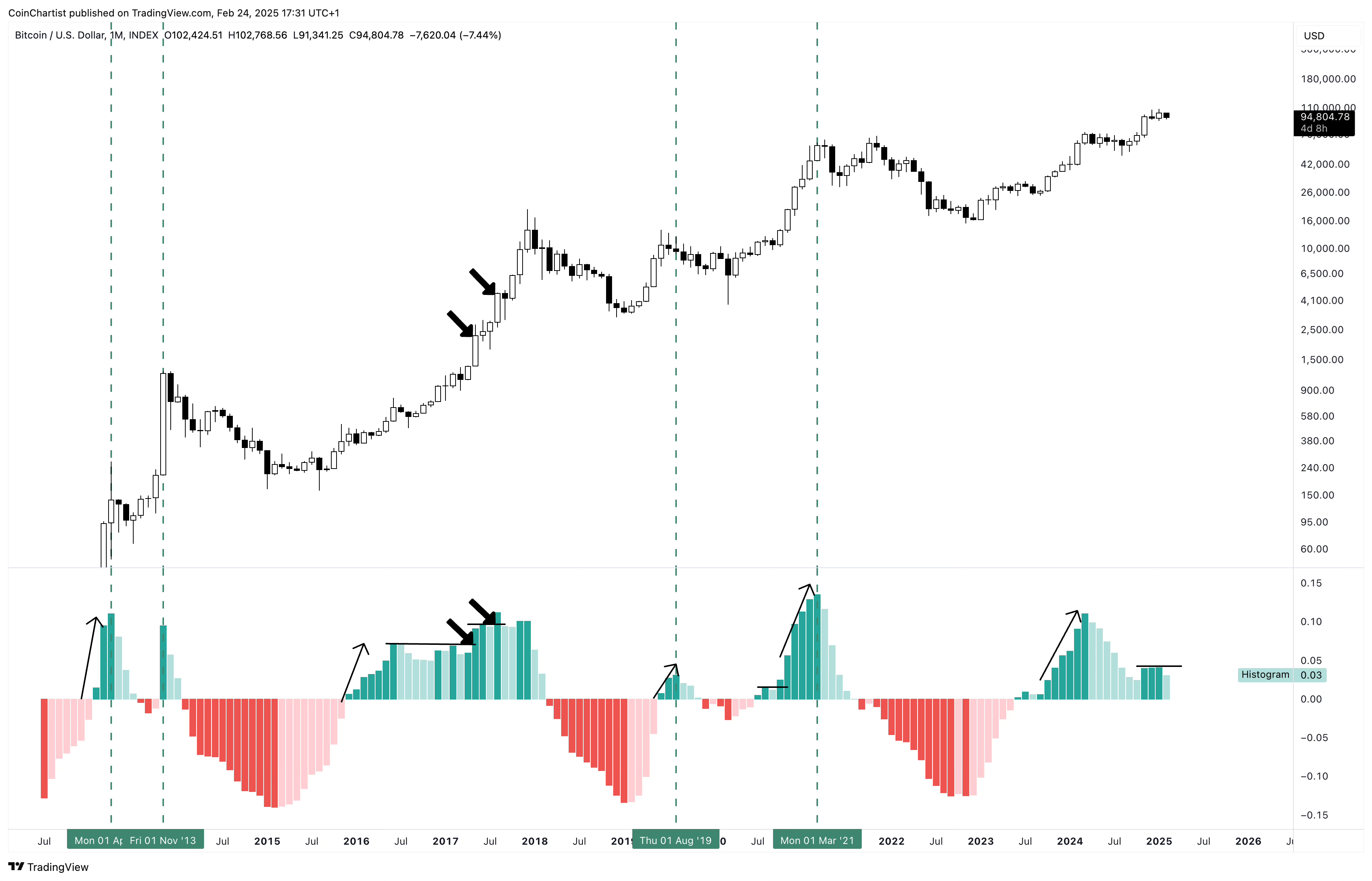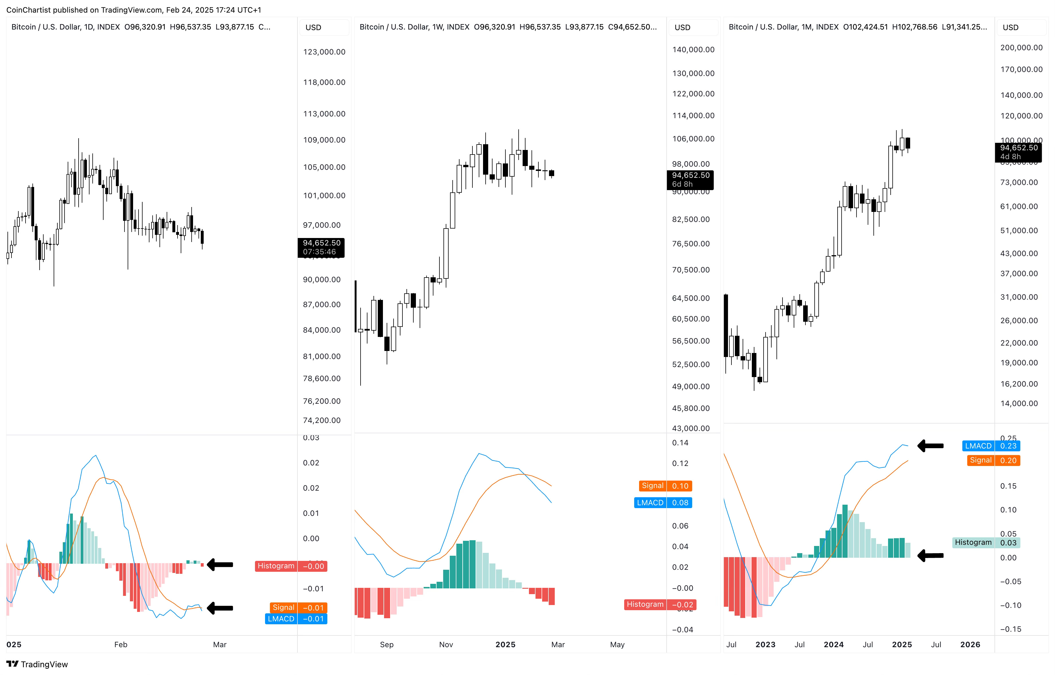 The negative sentiment surrounding the ByBit hack and what’s going on with altcoins, Ethereum, and meme coins is starting to pull Bitcoin’s momentum down. On the left, we have the daily starting to cross bearish. The middle shows the weekly with several weeks of increasing bearish momentum – ticks will have to turn pink before we see a reversal. On the right, we have the monthly, which is starting to inch closer toward a bearish crossover. The LMACD line is starting to curl downward and the histogram is showing a light green tick highlighting weakening bullish momentum. Weak bullish momentum can quickly turn into bearish momentum with a crossover.