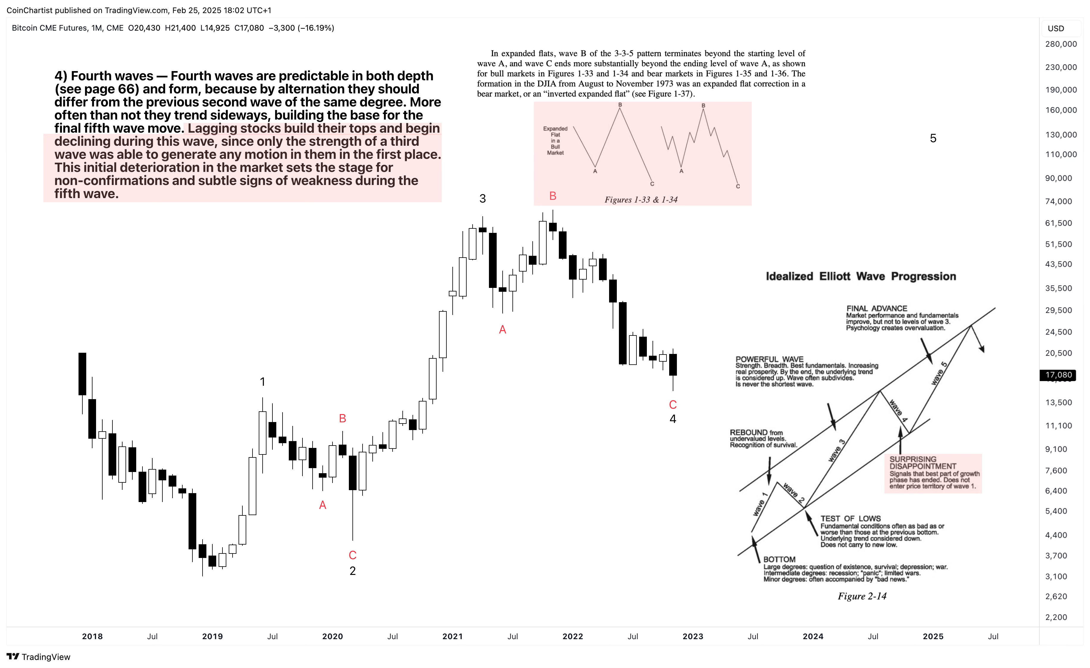 Wave 4 was indeed a surprising disappointment. Considering the strength of wave 3 and the economic backdrop, expectations of $100K+ Bitcoin were rampant. Yet Bitcoin fell to $16K instead after a failure to make a sustainable higher high. A weak higher high with non-confirmation signals such as a lack of volume is a hallmark of a B wave in a flat correction. Worse yet, we got an expanded flat in which the C wave vastly overshot the A wave. Importantly, the EW textbook states that “stocks build their tops and begin declining during this wave, since only the strength of a third wave was able to generate any motion in them in the first place.” This initial deterioration in the market sets the stage for non-confirmations and subtle signs of weakness during the fifth wave,” it continues. More simply put, the bear market in individual assets begins with wave 4 and there isn’t a proper fifth wave.