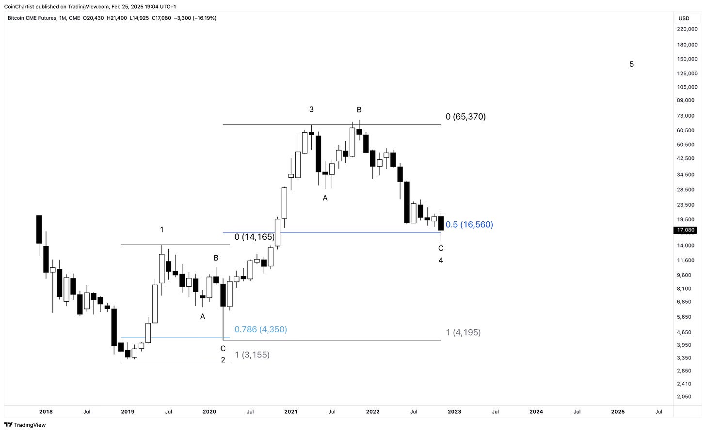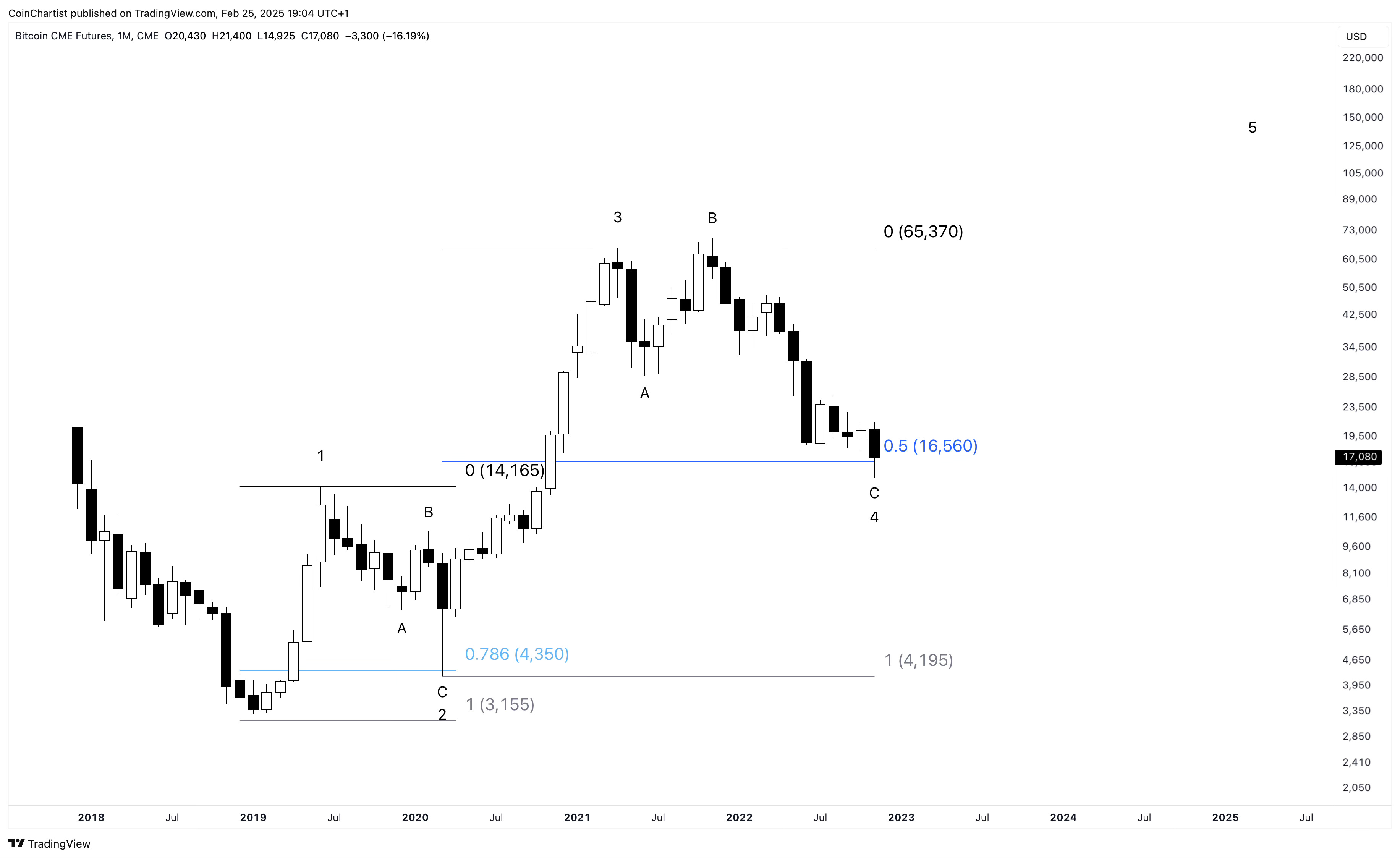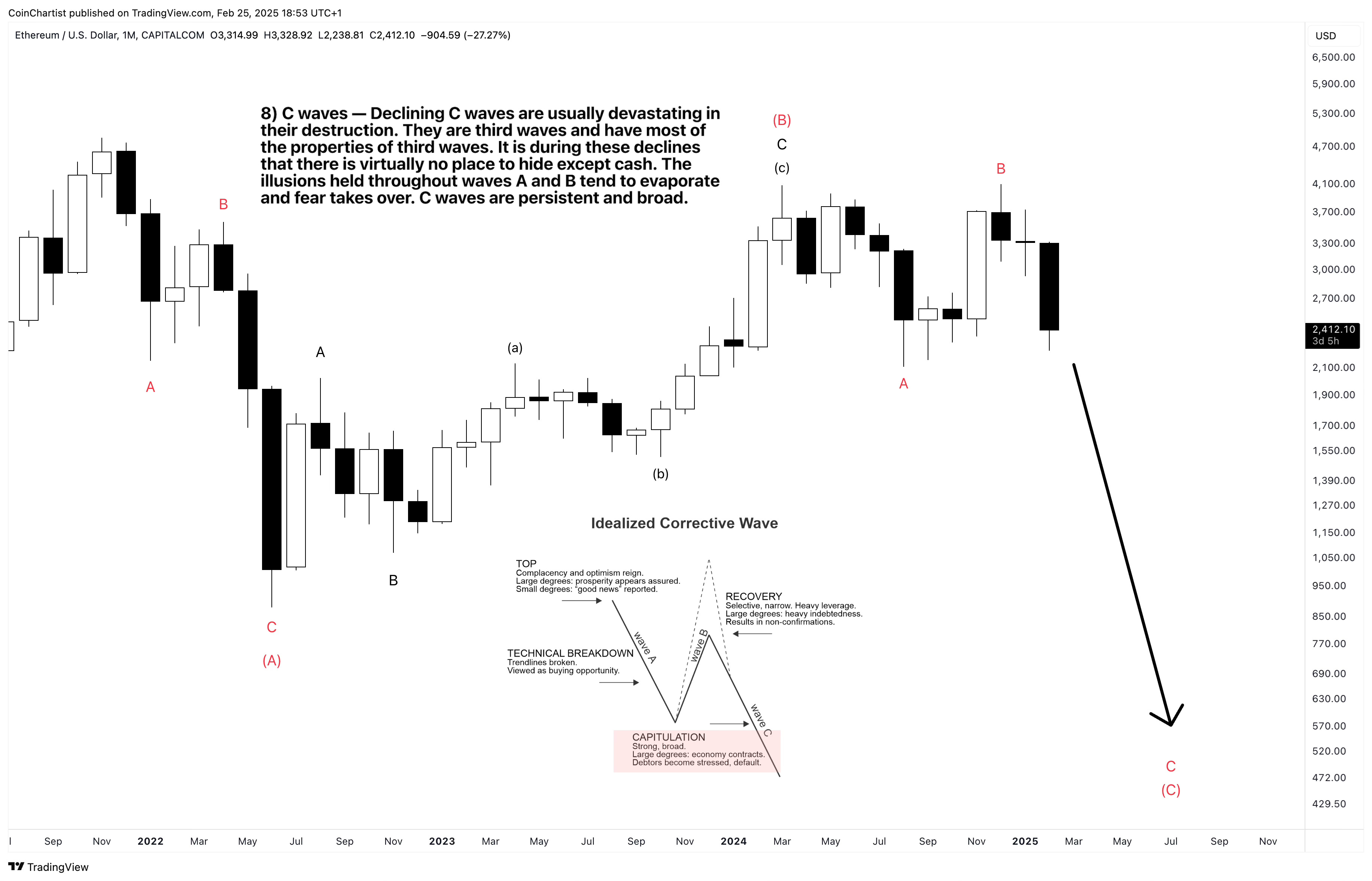 When a B wave ends, a “devastating” C wave begins. These are third waves, impulsive in behavior, and driven by emotions like fear. They’re often sharp, fast, and exceed the low of the A wave. This reality could mean that 2022 lows in ETHUSD could be taken out. A higher low could suggest Ethereum is forming a triangle, in which a D and E wave would follow.