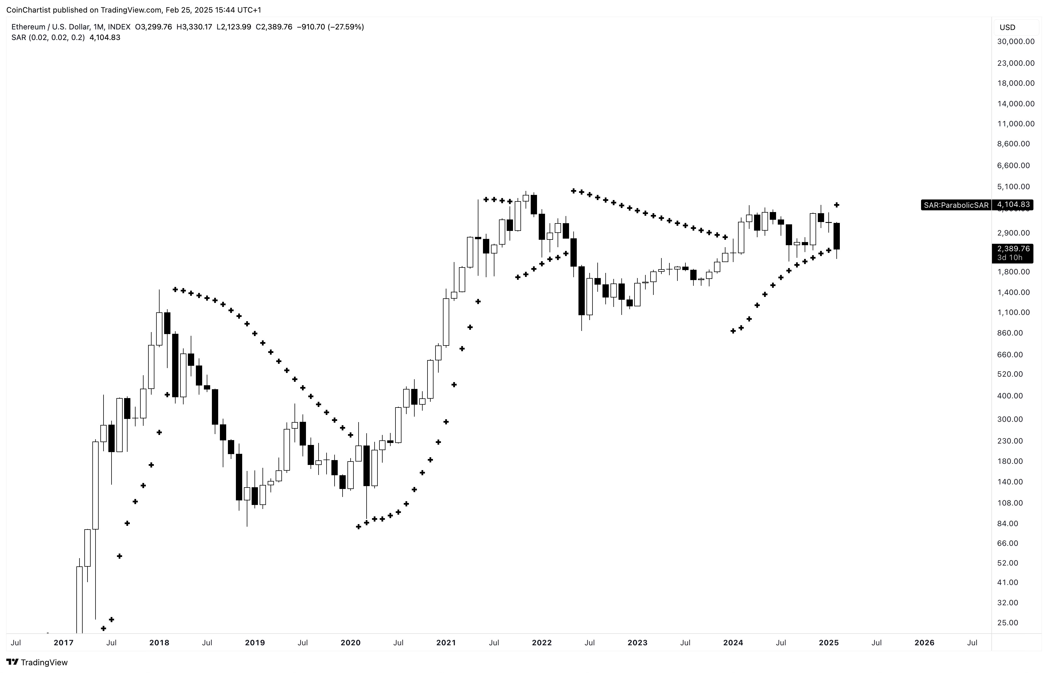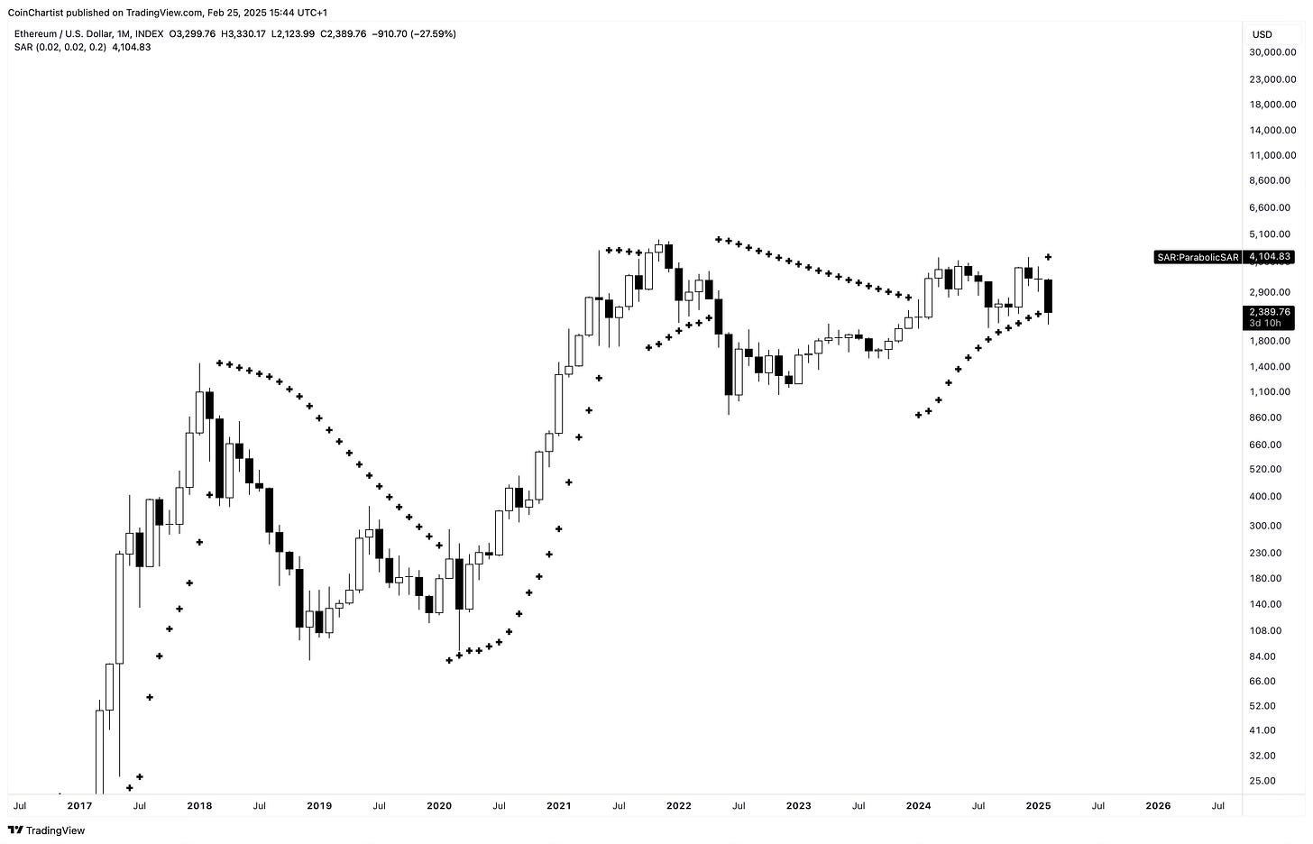 Ethereum has triggered the Parabolic SAR on the monthly. SAR stands for stop and reverse, and this tool could be telling us that the trend has stopped and reversed back into a bearish phase.