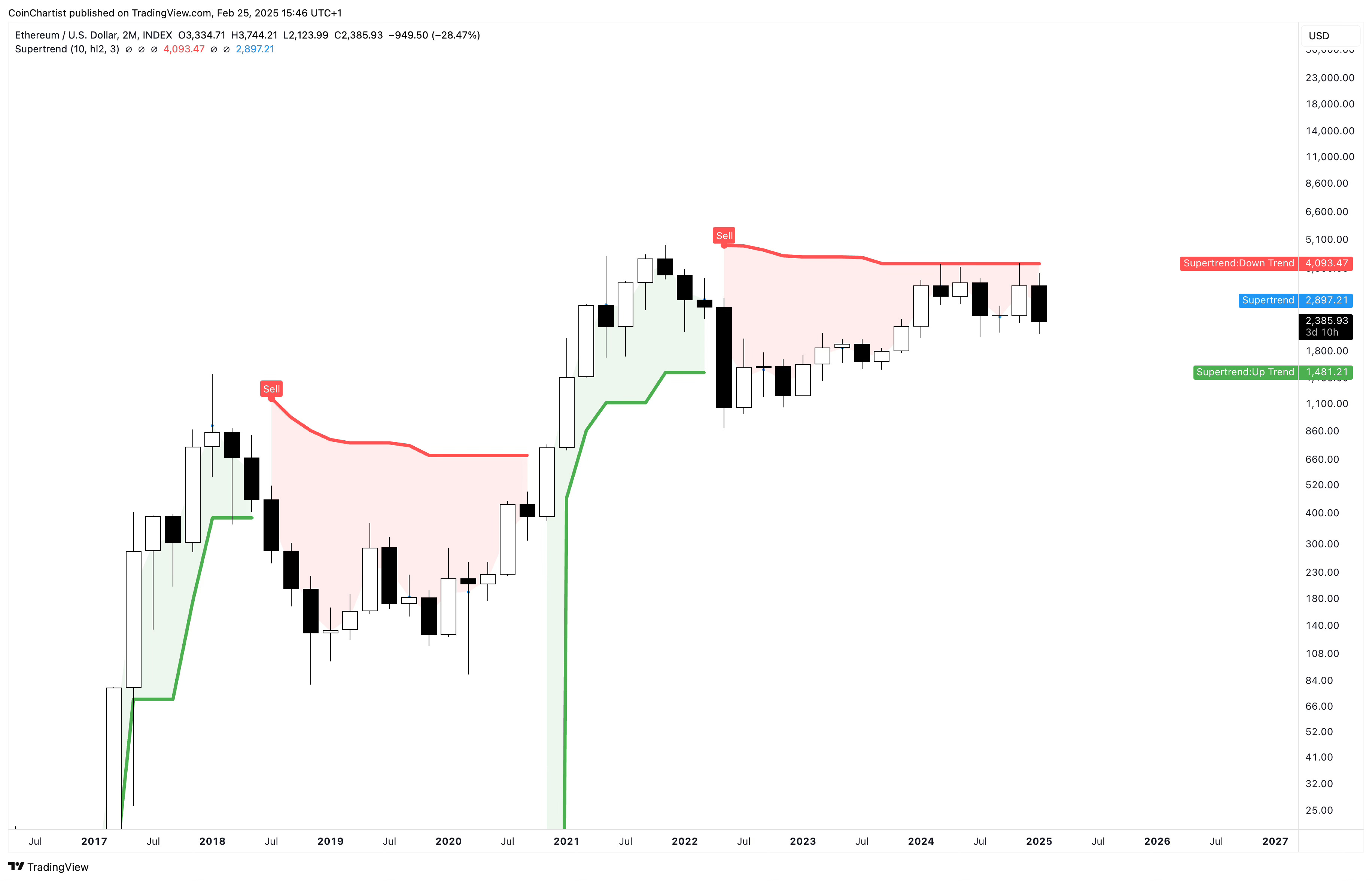 The 2M SuperTrend sell signal dynamic trend line was too strong of resistance to break, prompting the rejection we’ve seen. 2020 shows what a proper bullish impulse looks like compared to what we are witnessing the last few years in Ether.